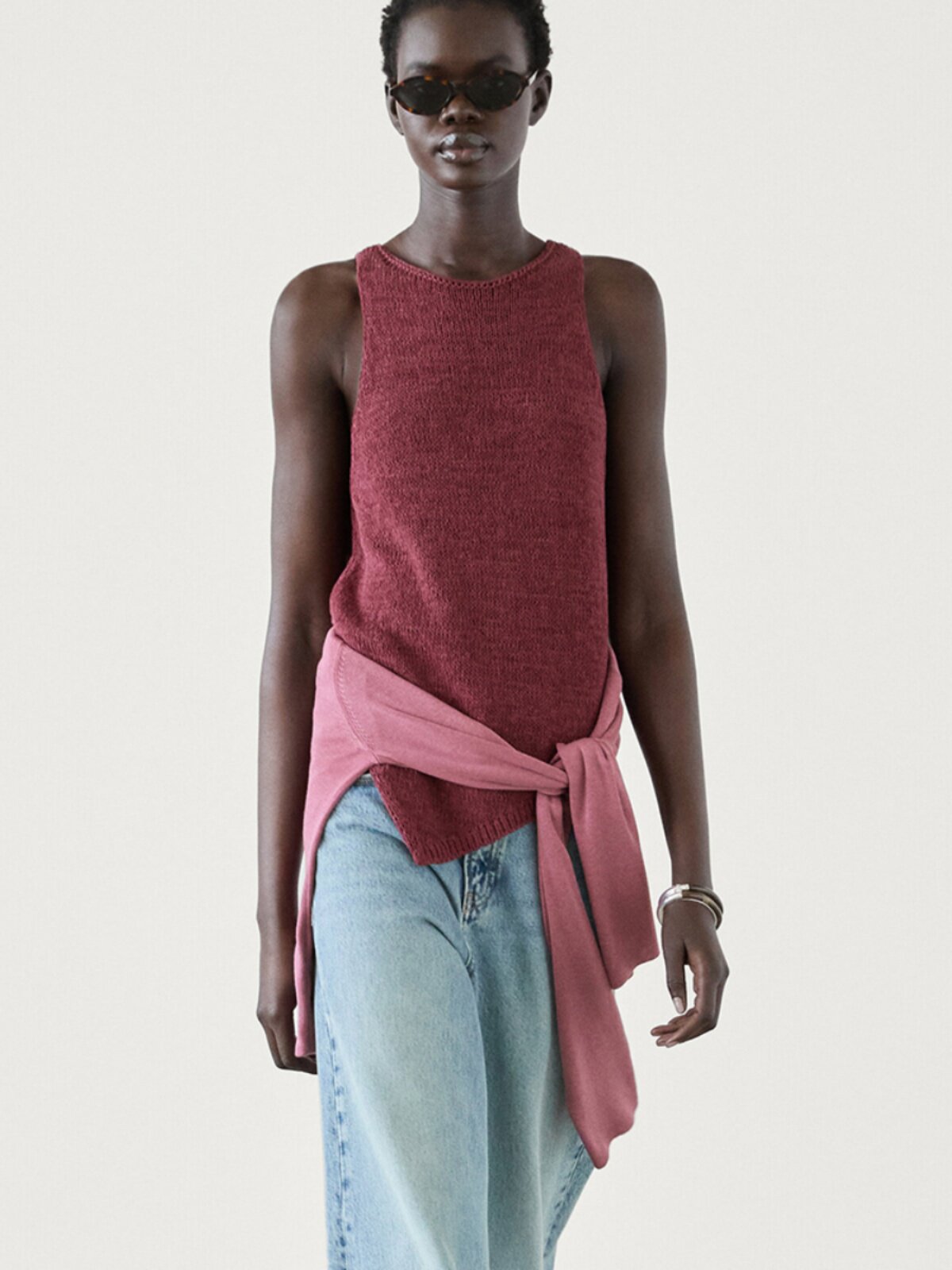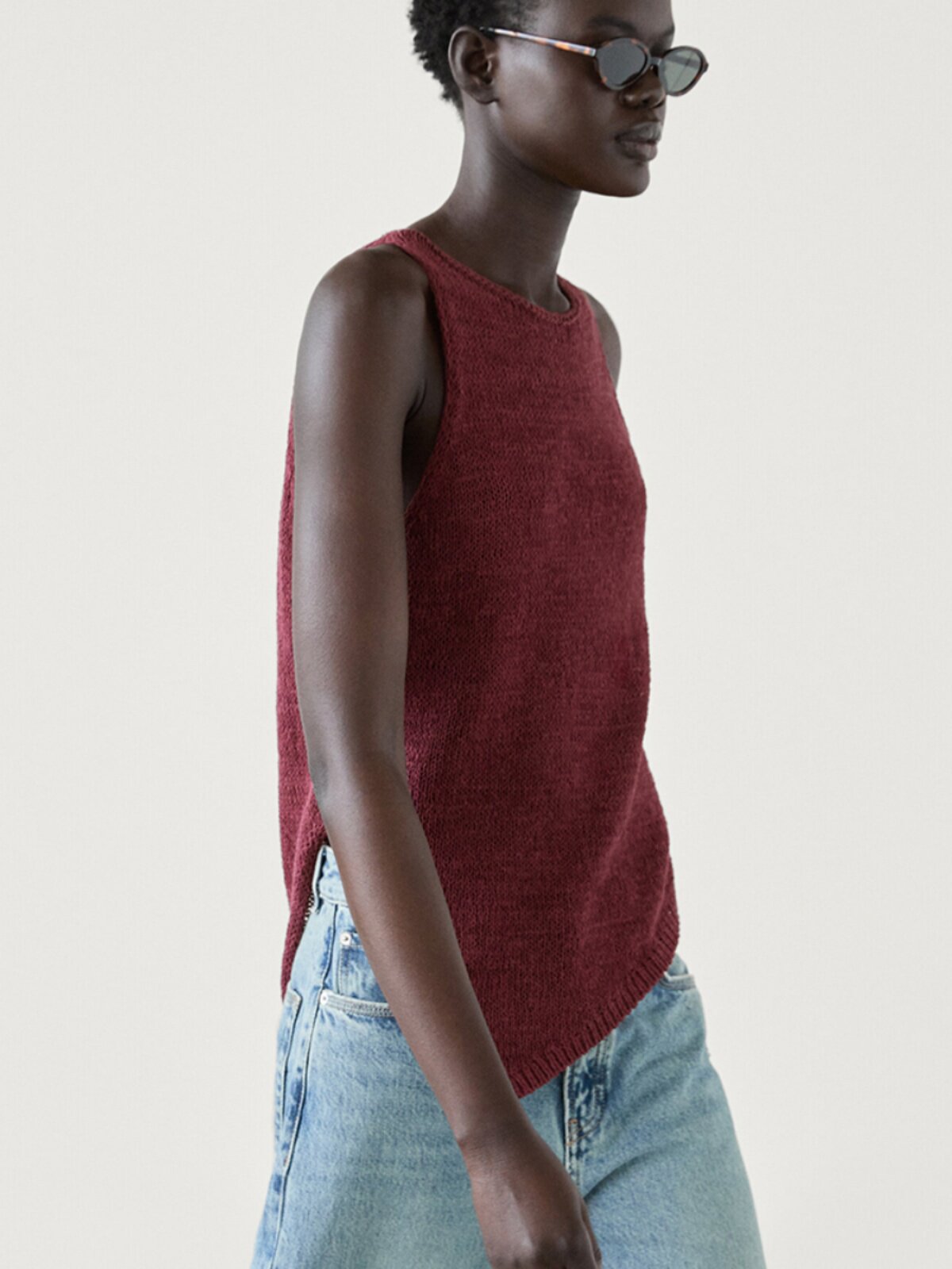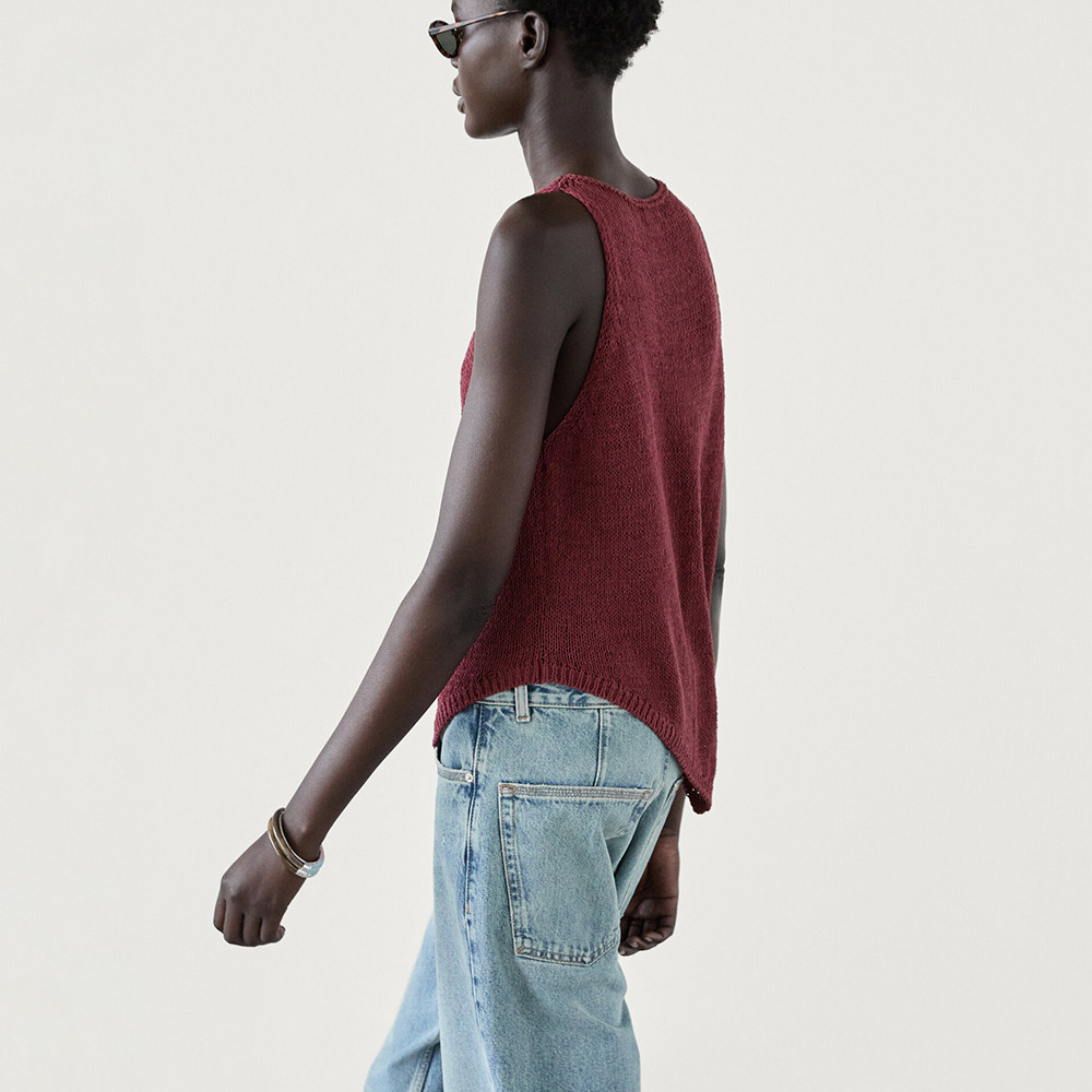Женский хлопковый вязаный топ без рукавов с круглым вырезом и асимметричным подолом античного красного цвета MD 05737510555