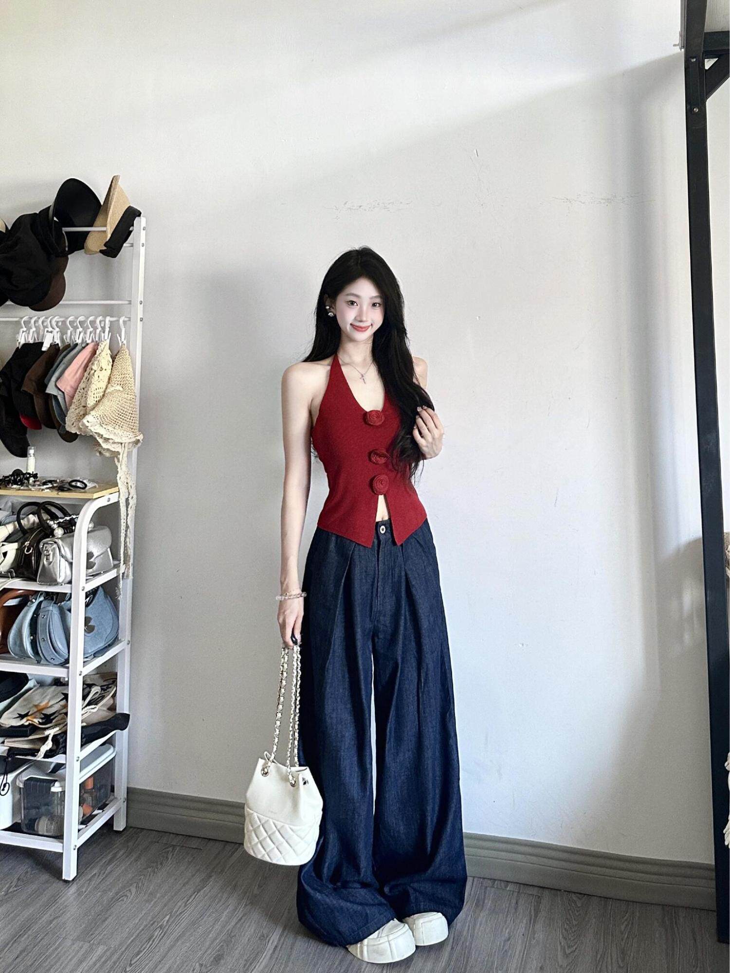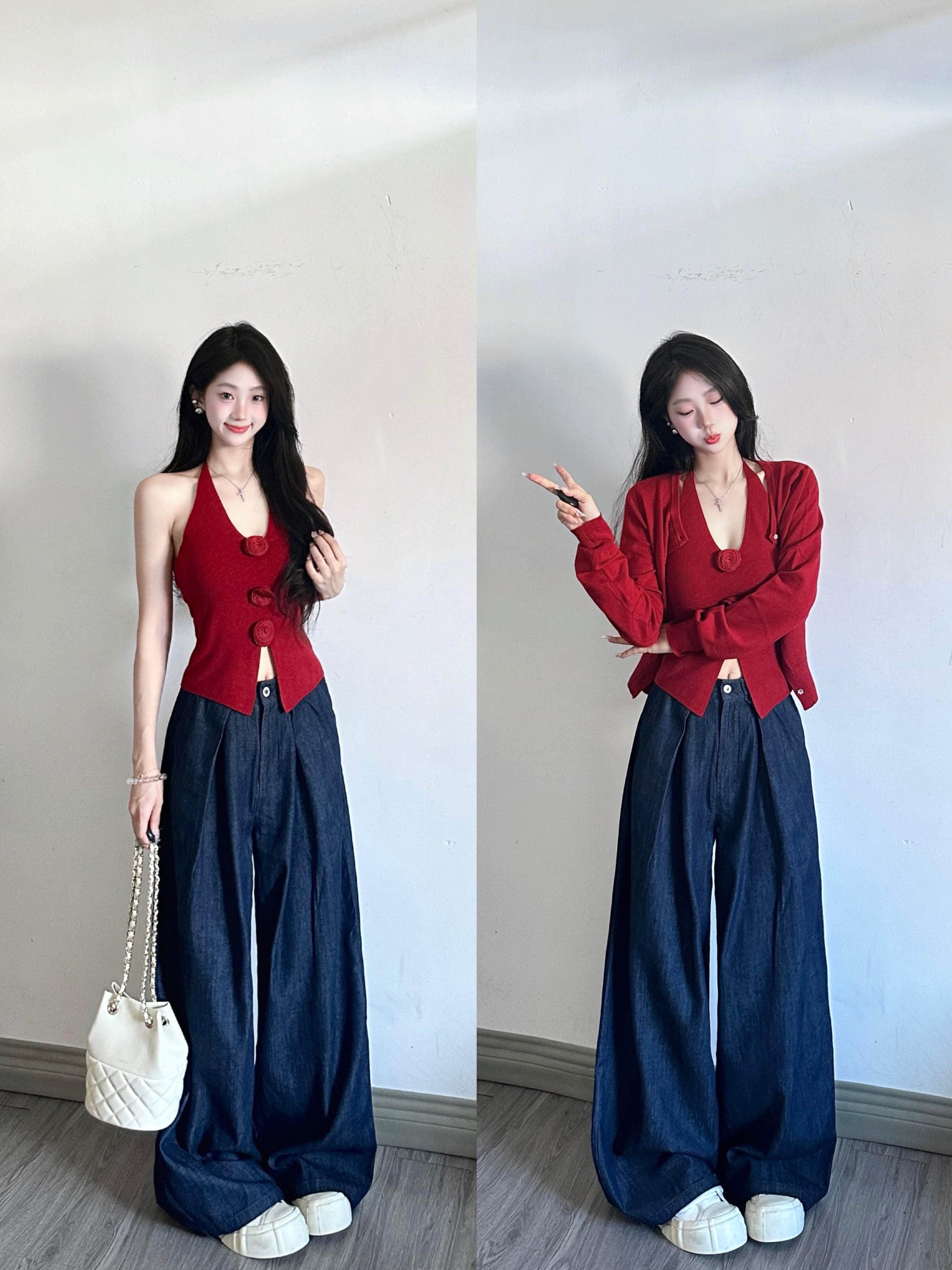 Красный осенний модный комплект, кардиган, майка, французский стиль, облегающий крой, в цветочек