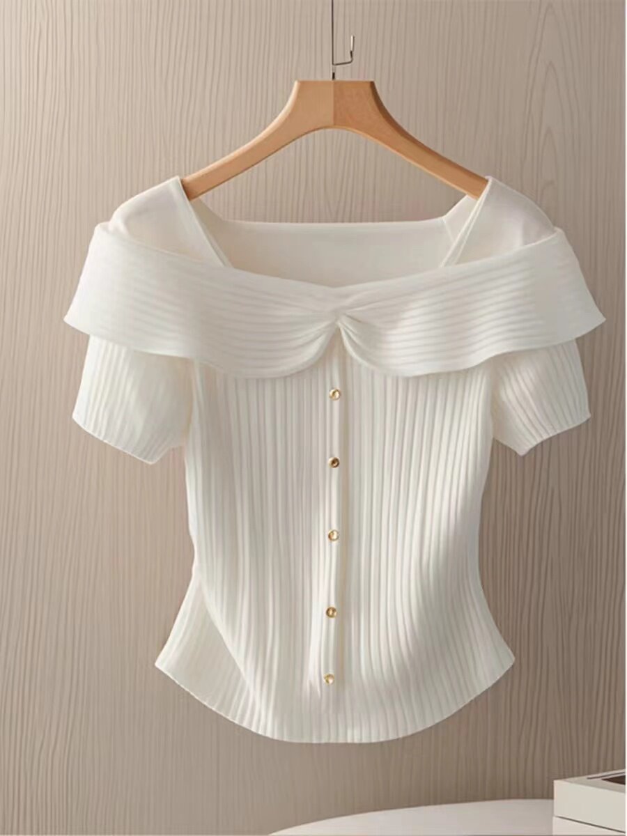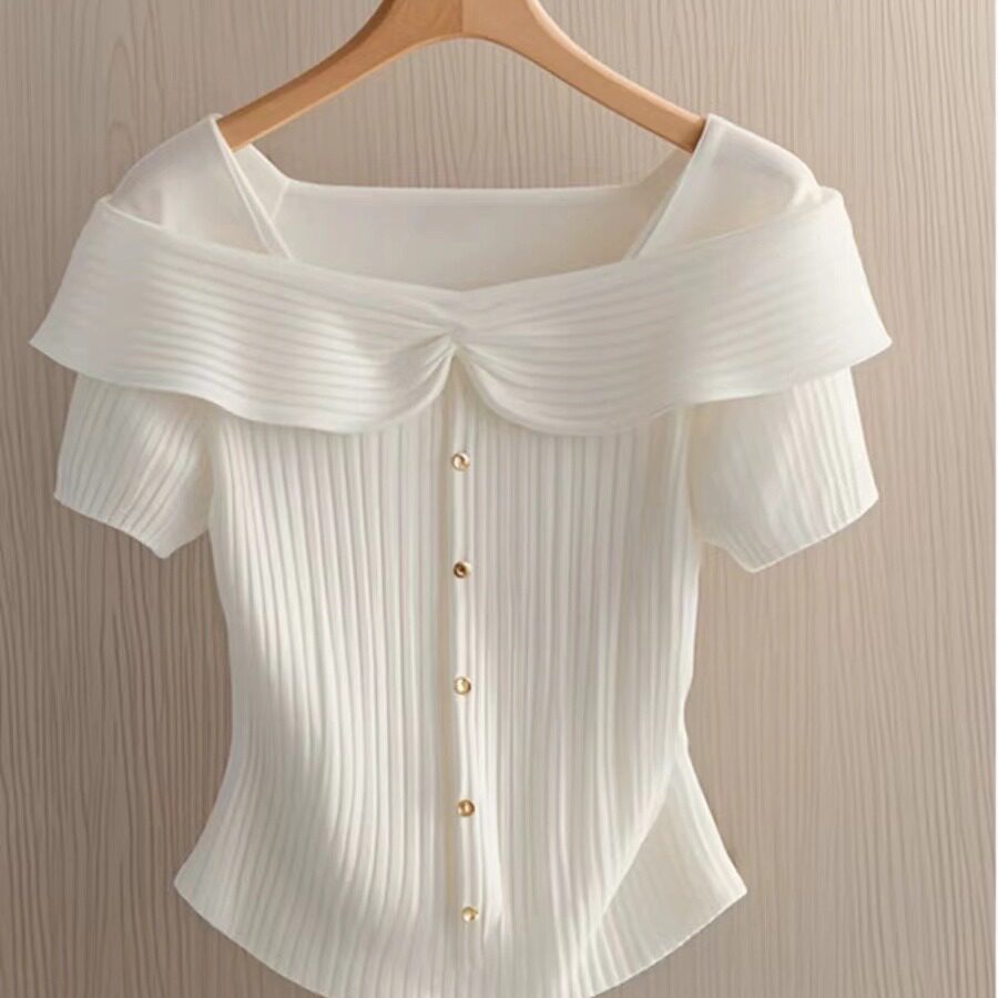 Трикотажный летний короткий свитер, французский стиль, квадратный вырез, в западном стиле, городской стиль