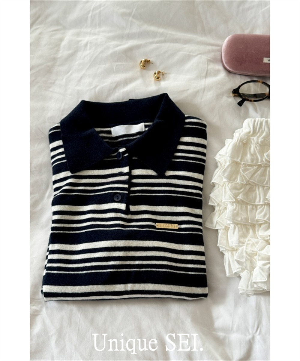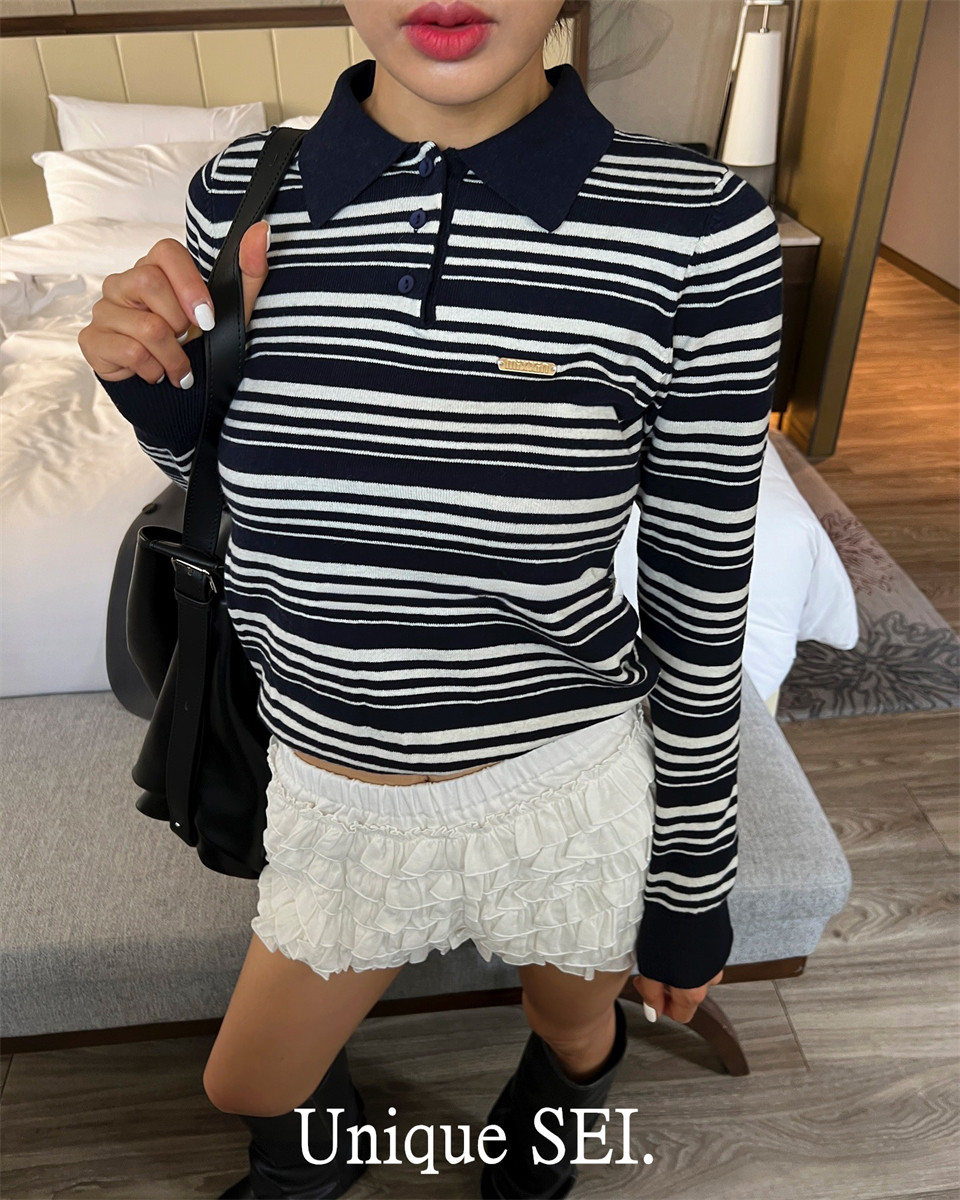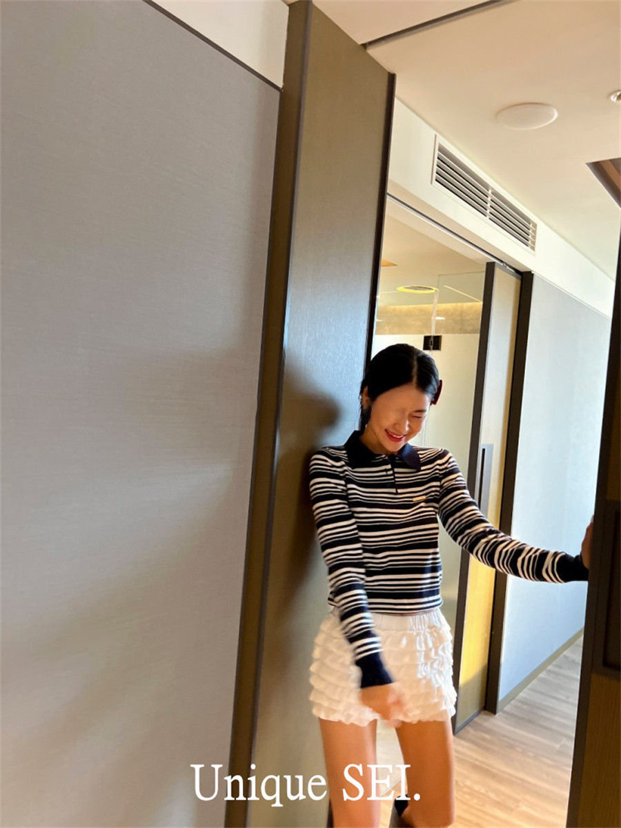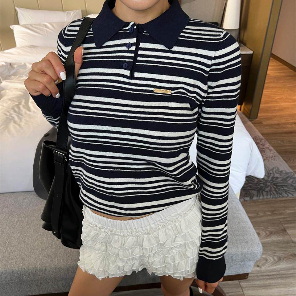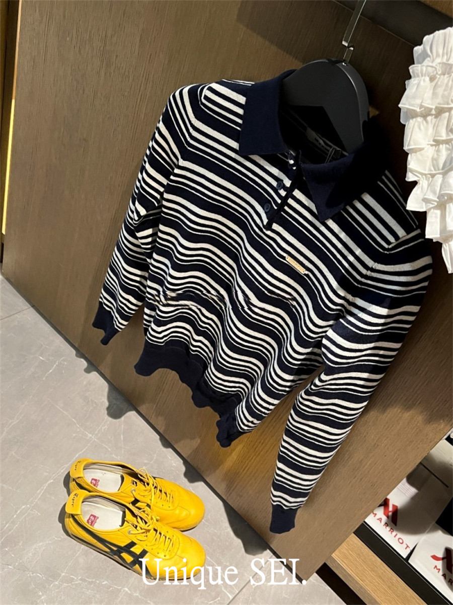 Уникальный свитер-поло в полоску с металлической этикеткой от уличного ретро-блогера SEI, топ для похудения