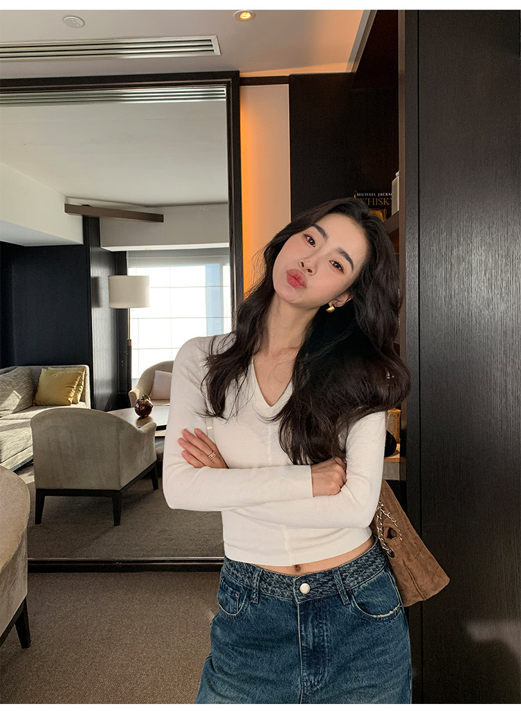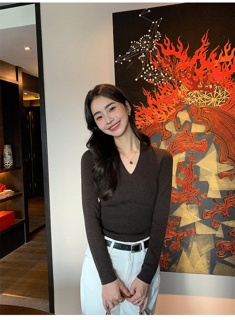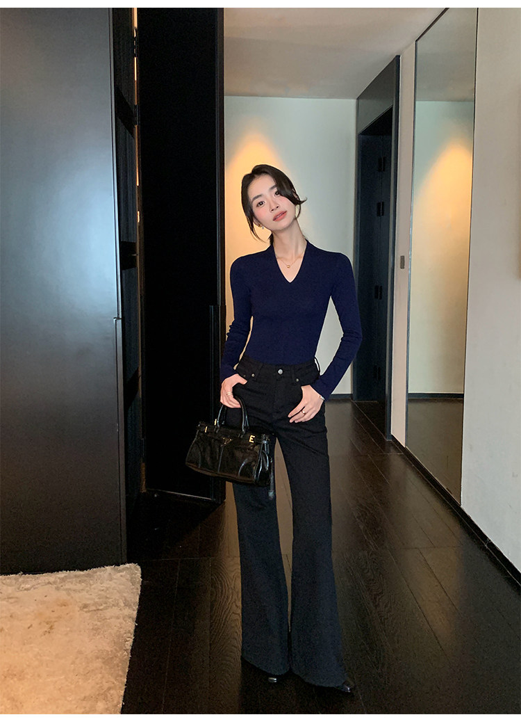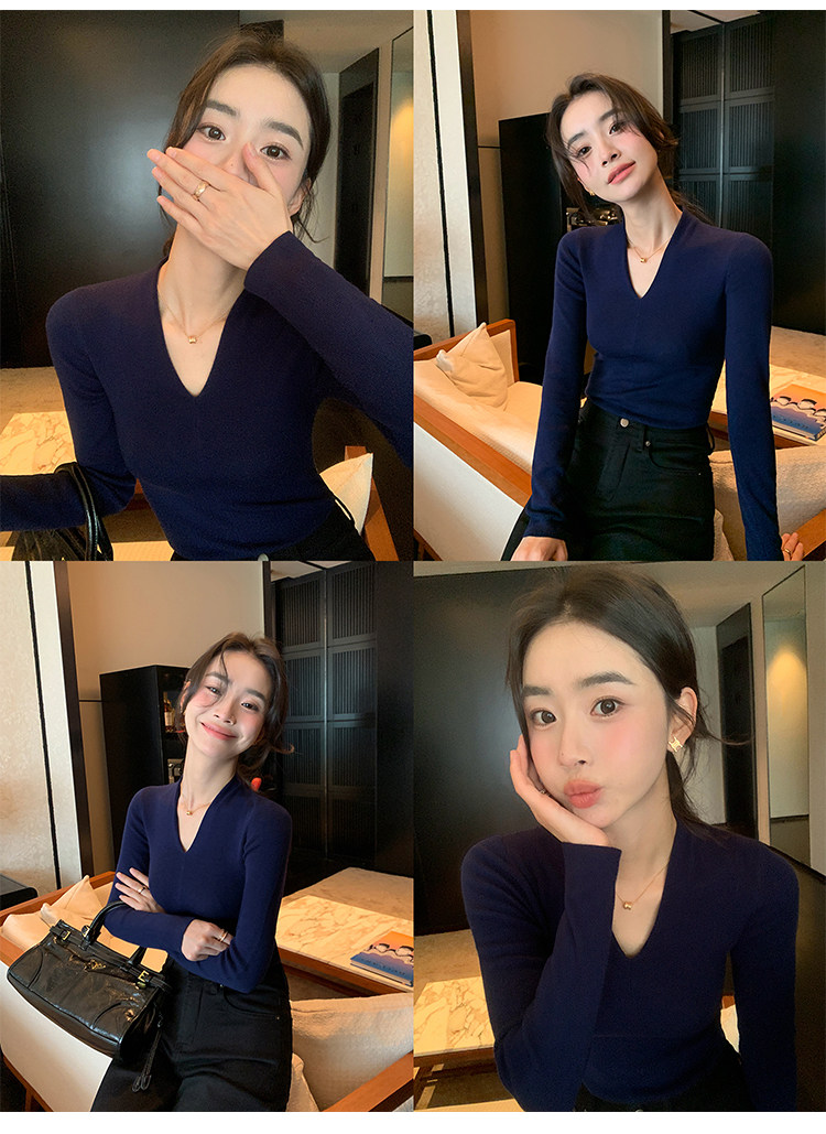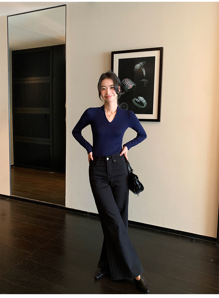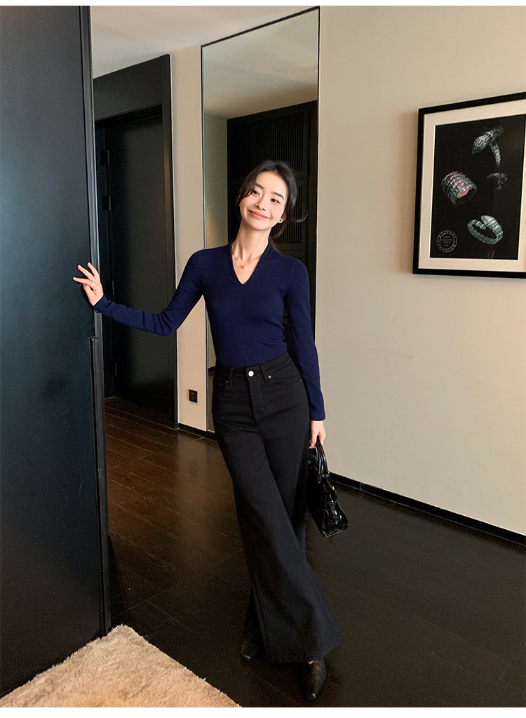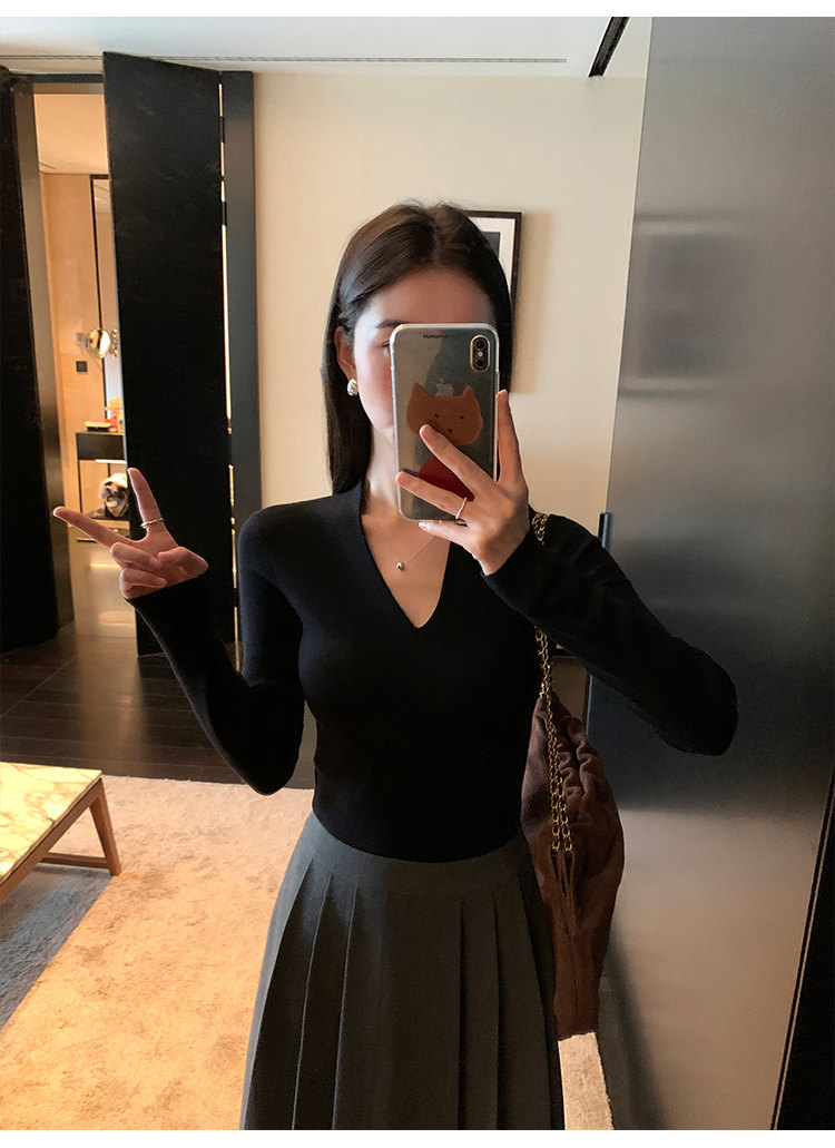 pusumede Черный трикотажный лонгслив, демисезонный базовый свитер, V-образный вырез, облегающий крой