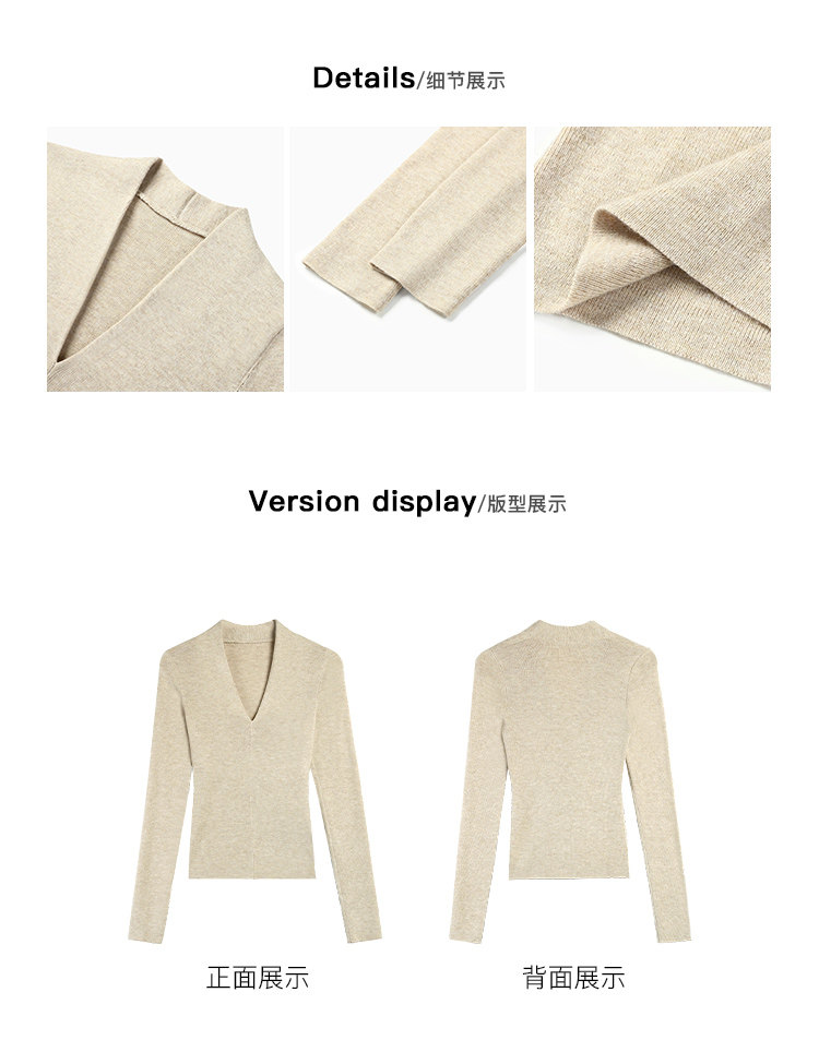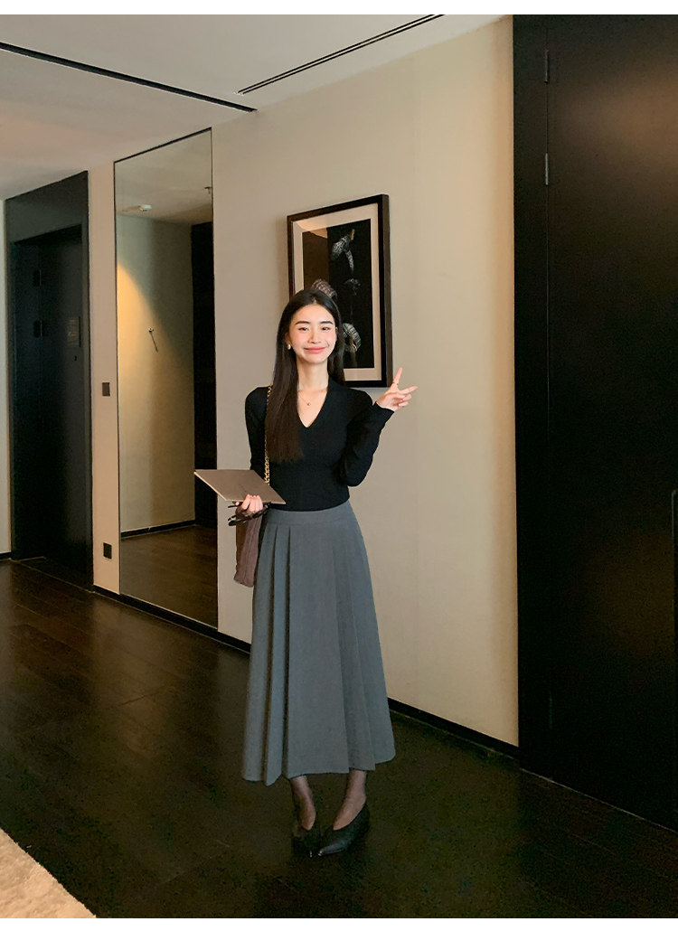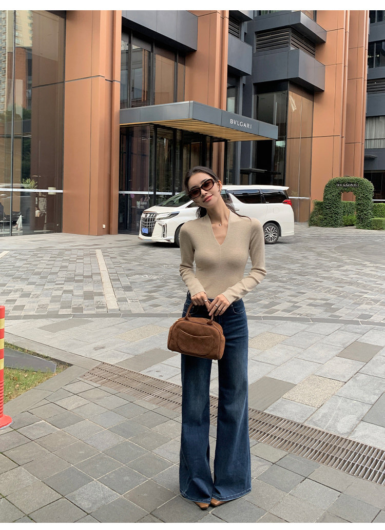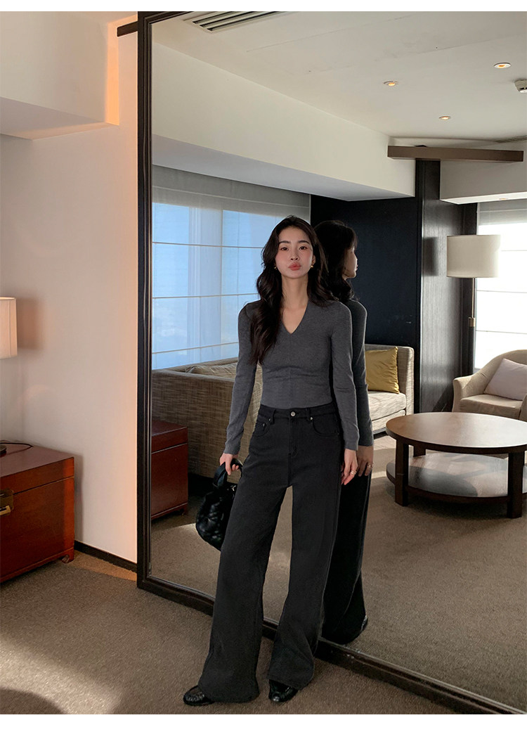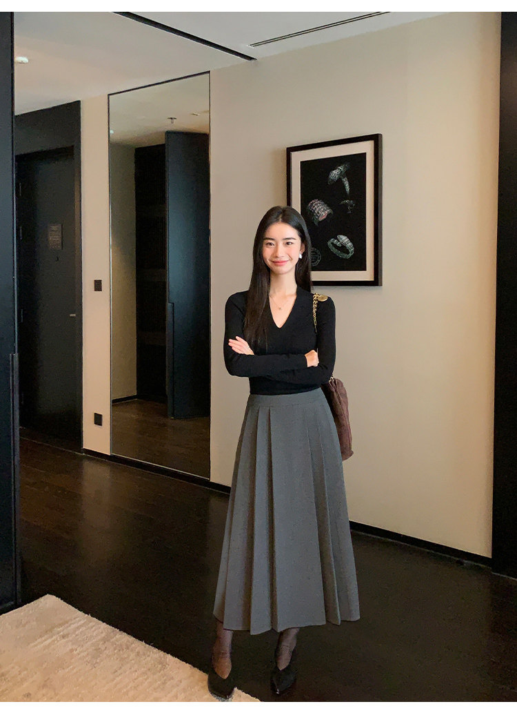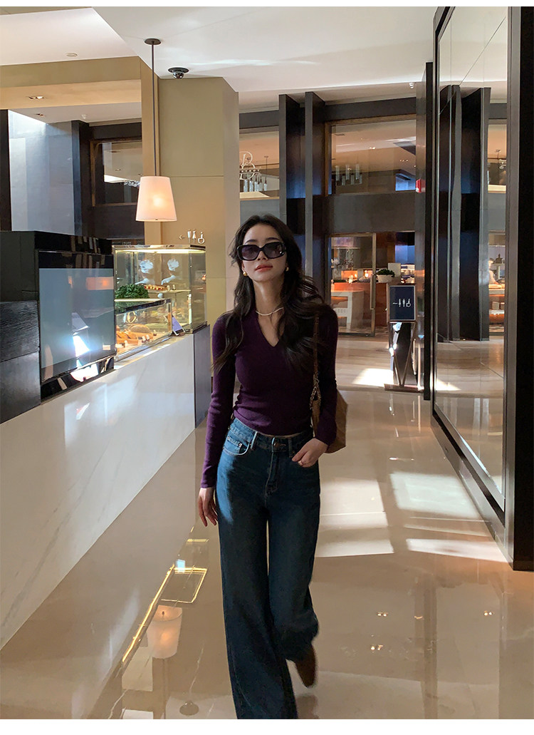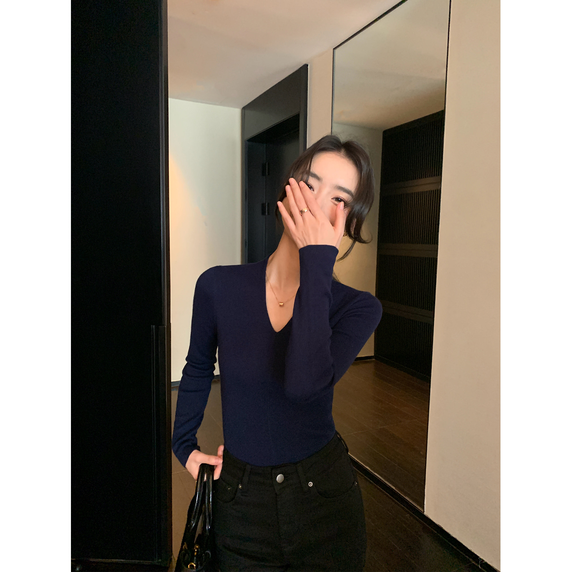 pusumede Черный трикотажный лонгслив, демисезонный базовый свитер, V-образный вырез, облегающий крой