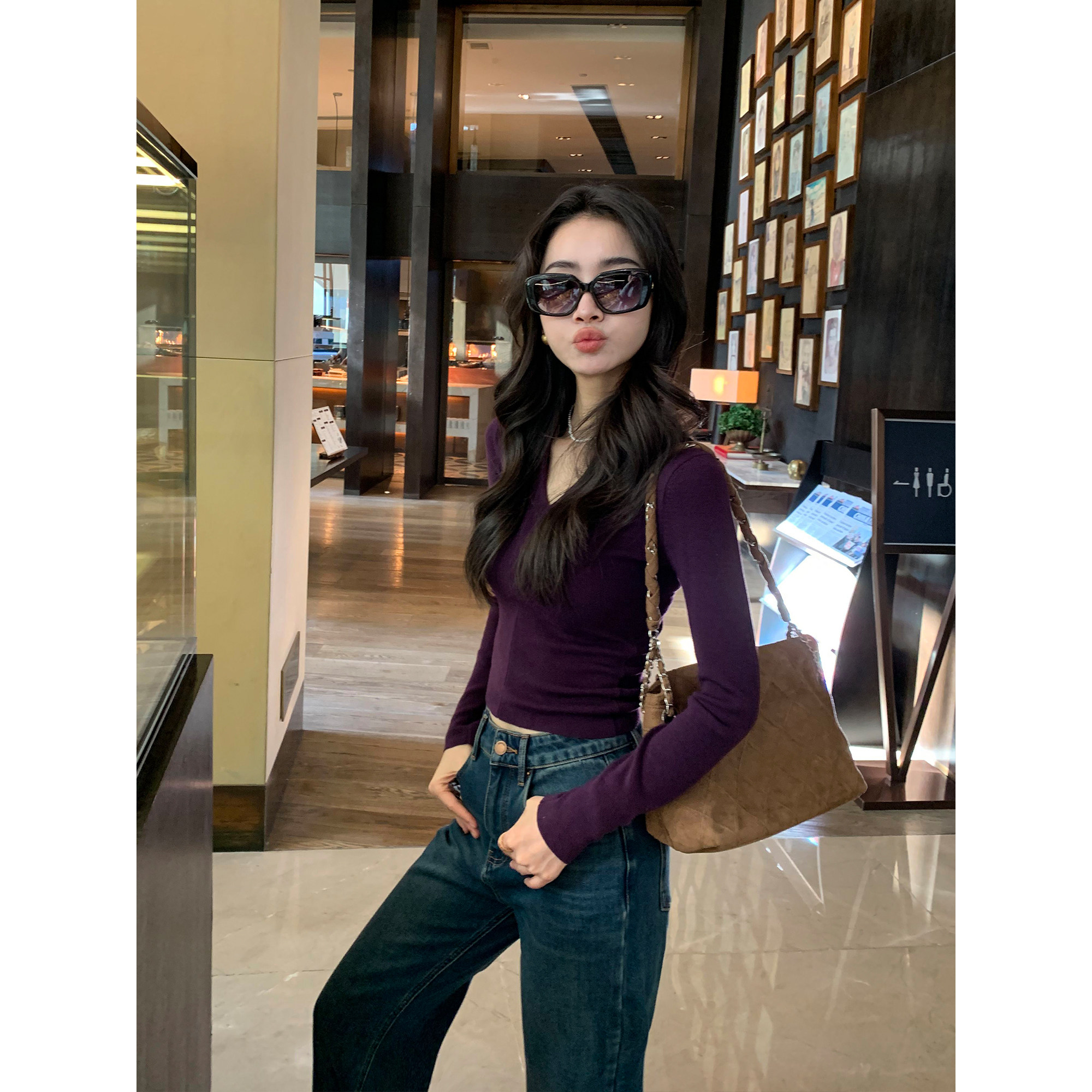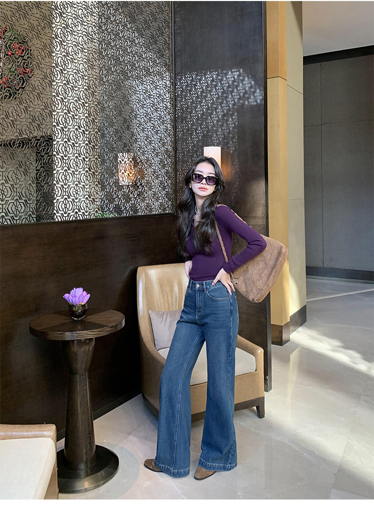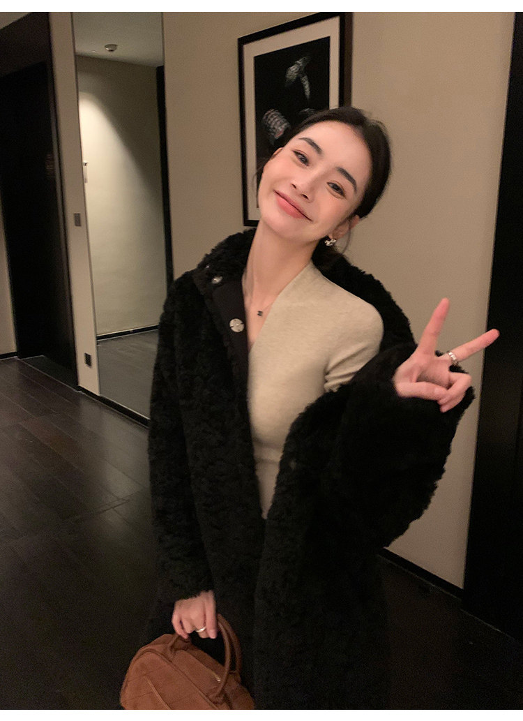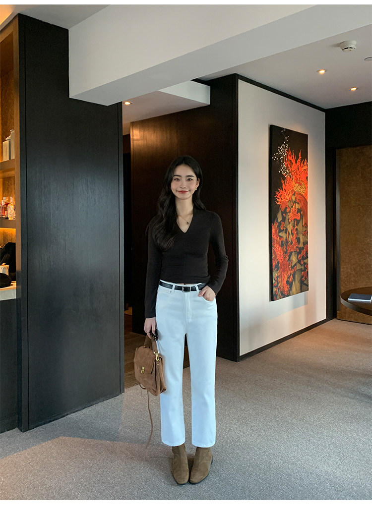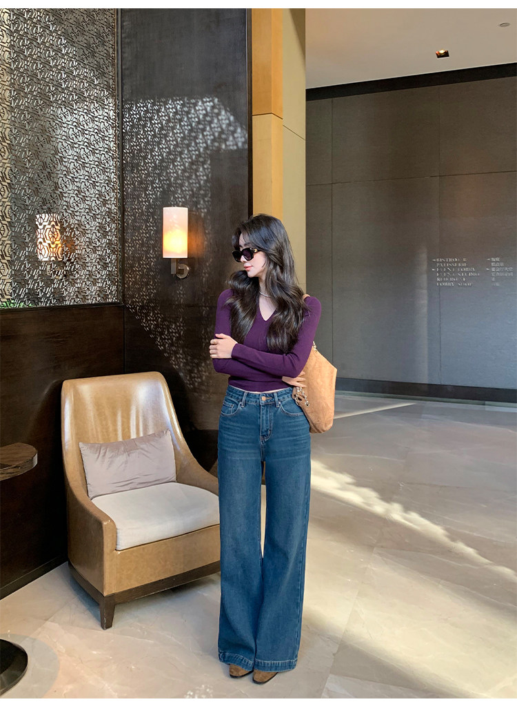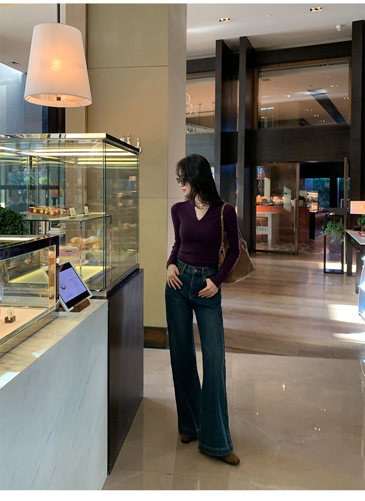 pusumede Черный трикотажный лонгслив, демисезонный базовый свитер, V-образный вырез, облегающий крой