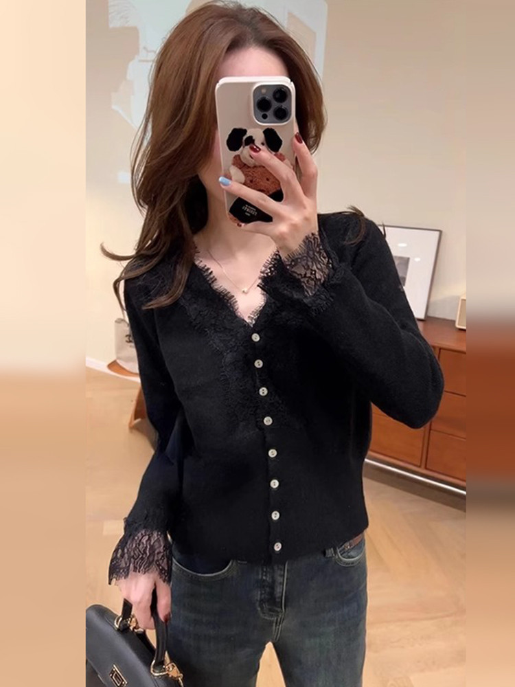 Кружевной лонгслив, демисезонный кардиган, базовый приятный телу свитер, французский стиль, V-образный вырез, 2024 года, городской стиль