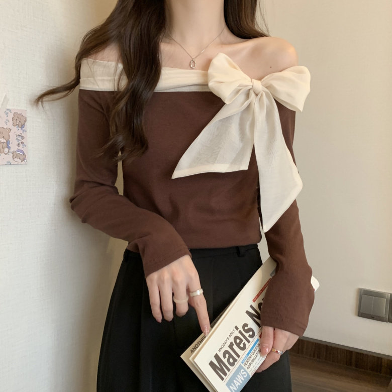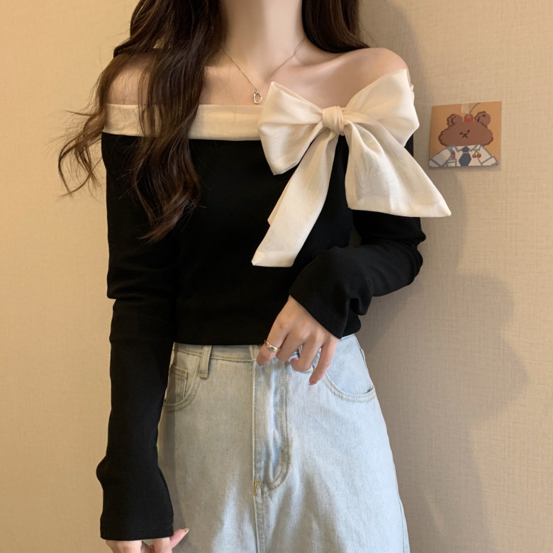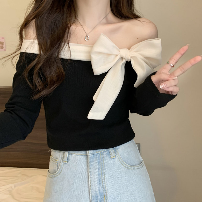 Трикотажный дизайнерский приталенный свитер с бантиком, французский стиль, открытые плечи, тренд сезона