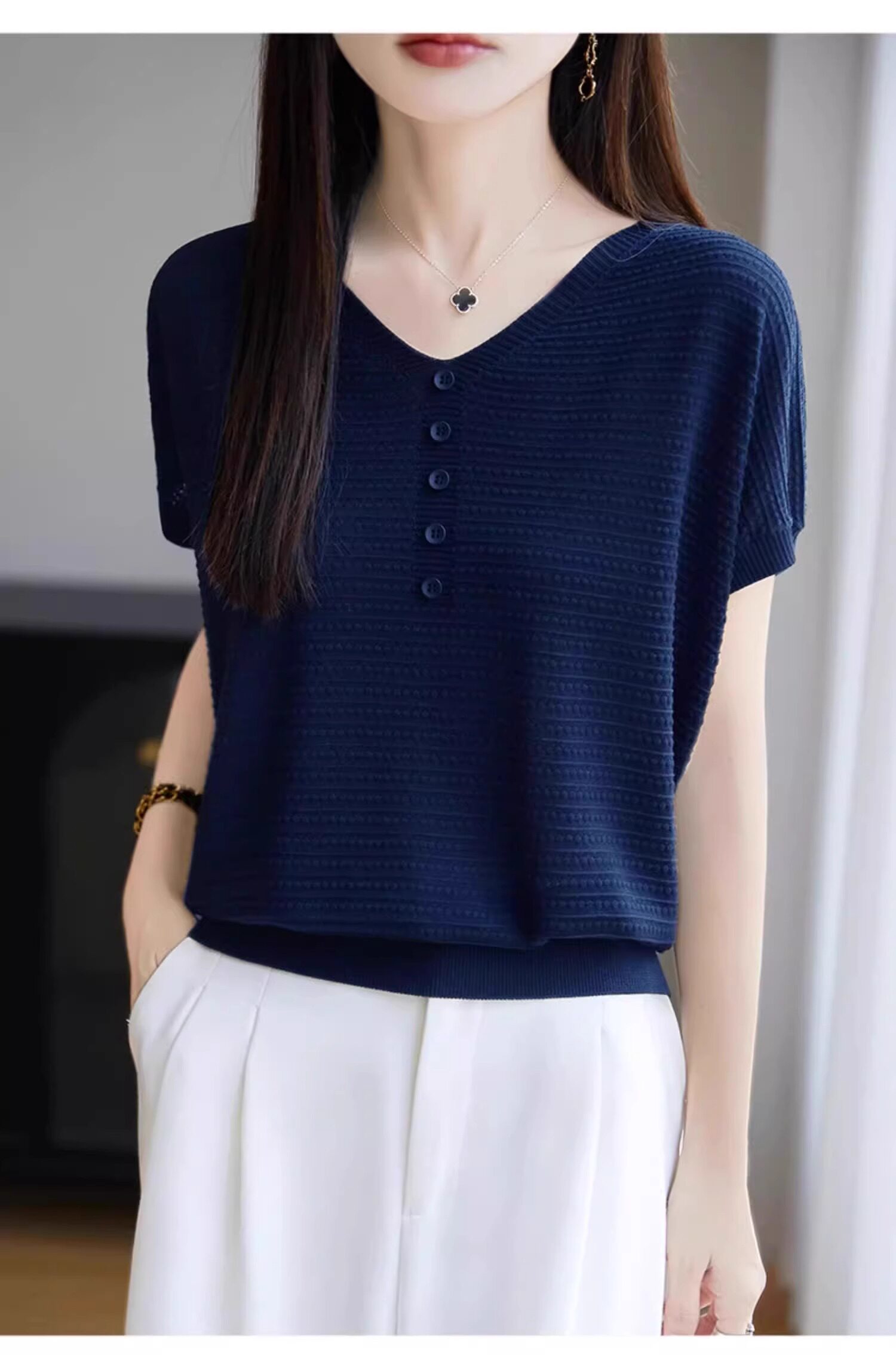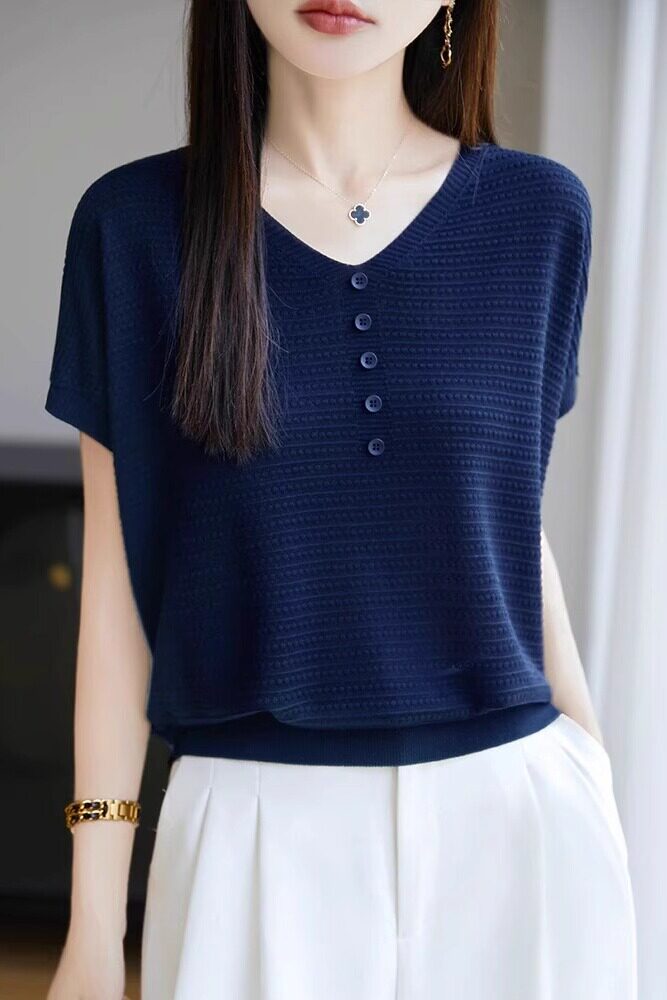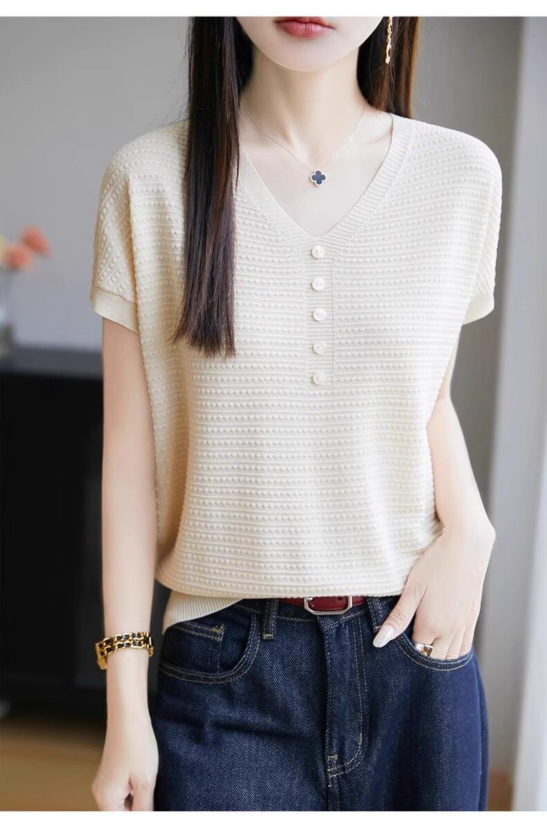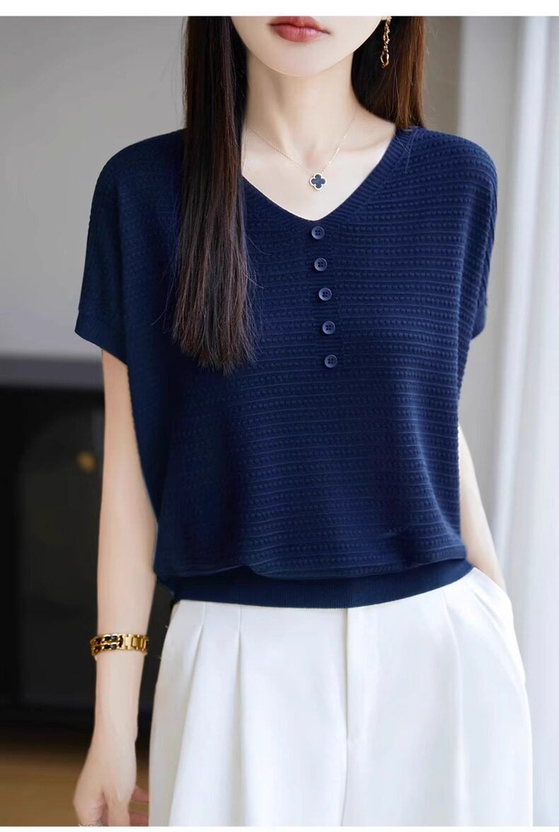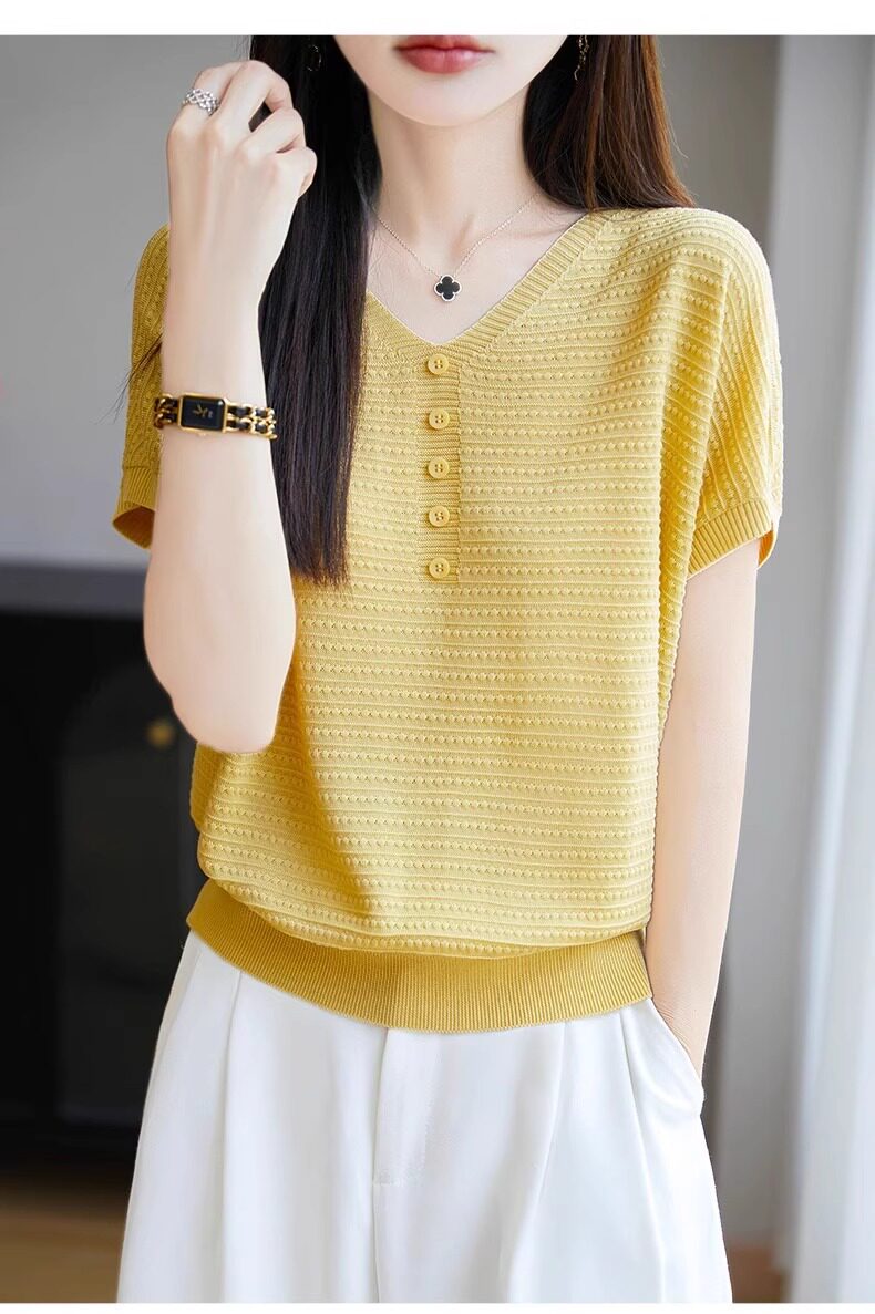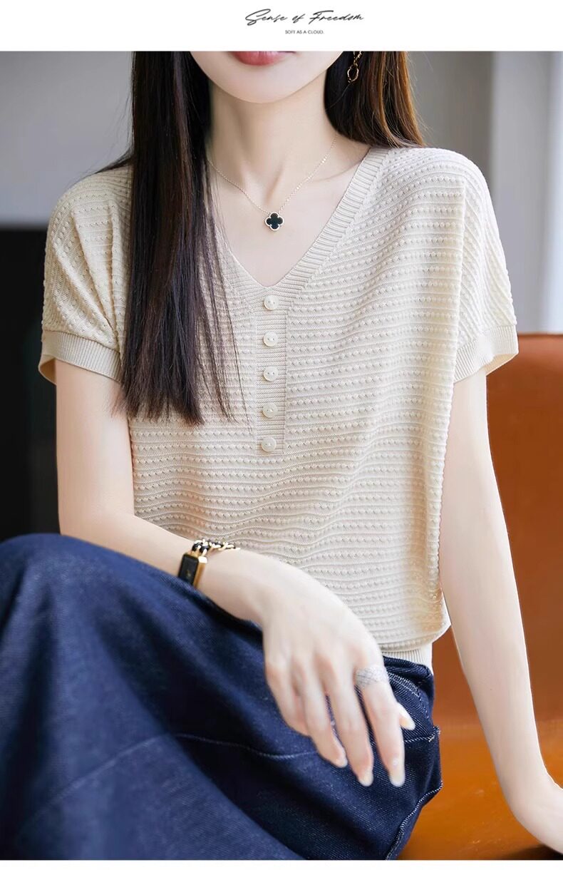 Трикотажная летняя футболка с коротким рукавом, французский стиль, V-образный вырез, свободный крой