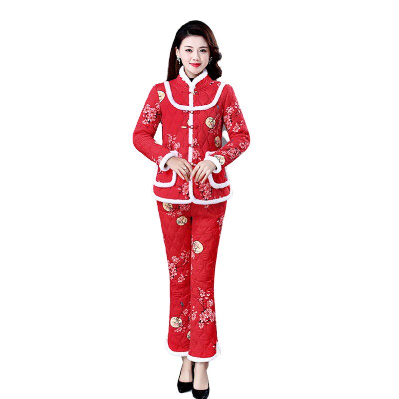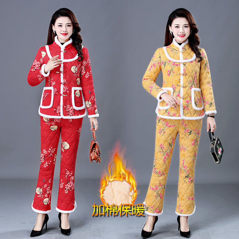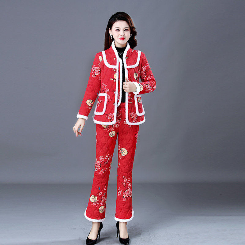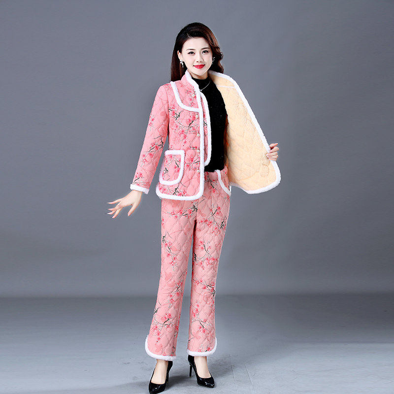 Пуховик для матери, штаны для пожилых людей, комплект, увеличенная толщина, для среднего возраста, оверсайз, цветочный принт