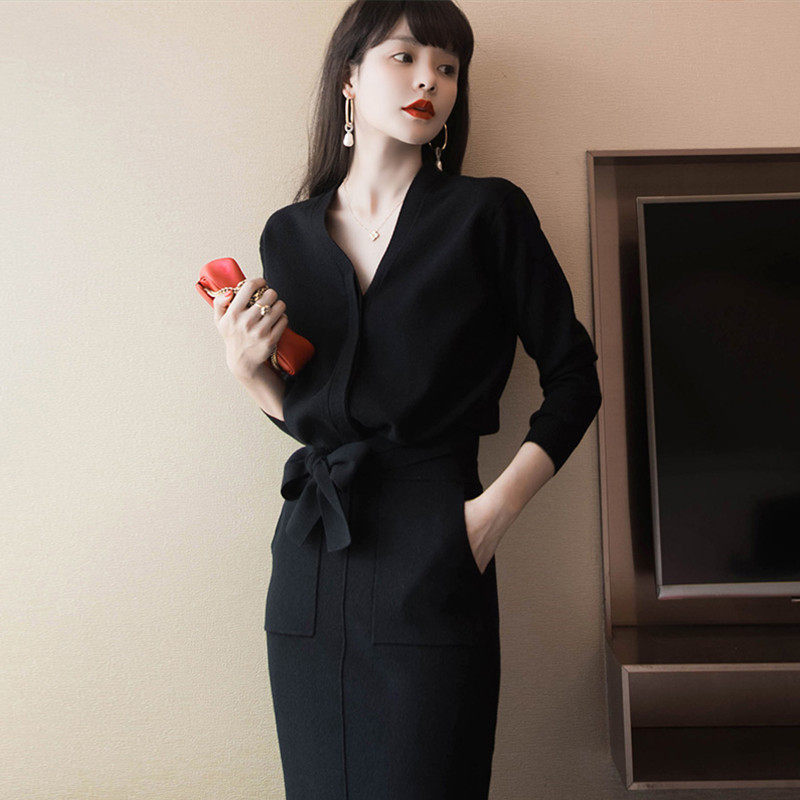 Демисезонное трикотажное платье, осеннее платье, свитер, черная юбка в складку, длинная юбка, комплект, французский стиль, V-образный вырез