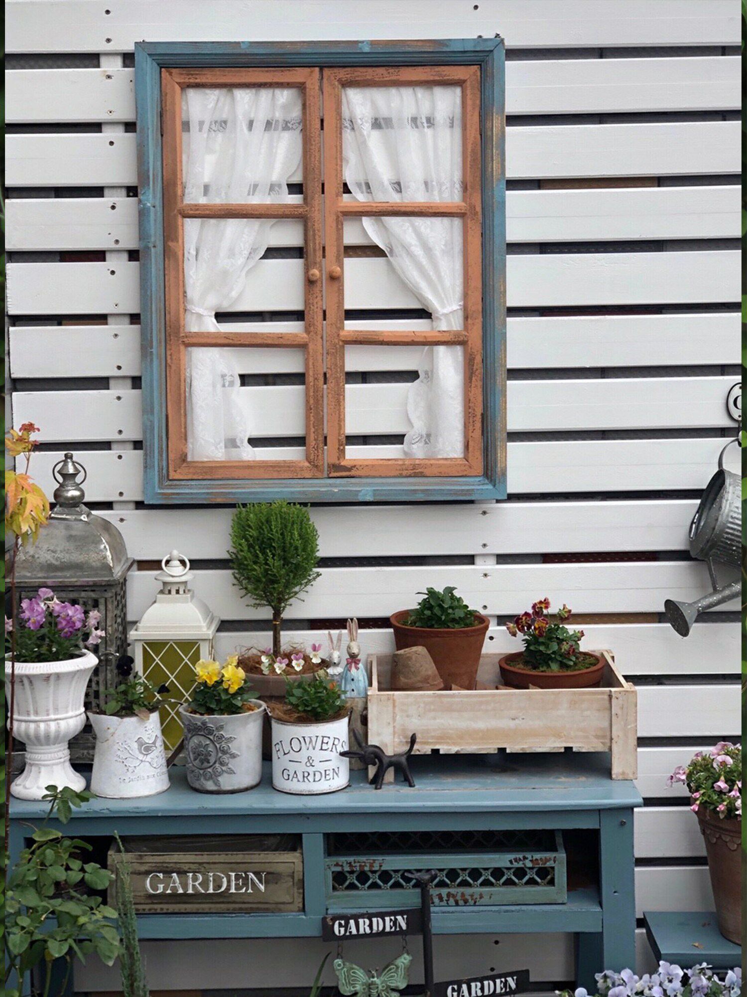 Деревни делают старую ретро -фальшивую оконную коробку декоративную подвеску с твердым деревом симуляции стена стена -декоративная творческая фотография в саду