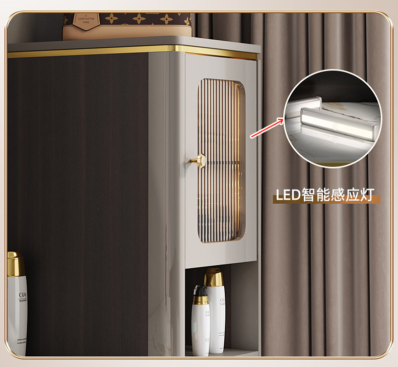 - Туалетный столик длиной 0,8 м + высокий шкаф большой вместимости + зеркало для макияжа со светодиодной подсветкой