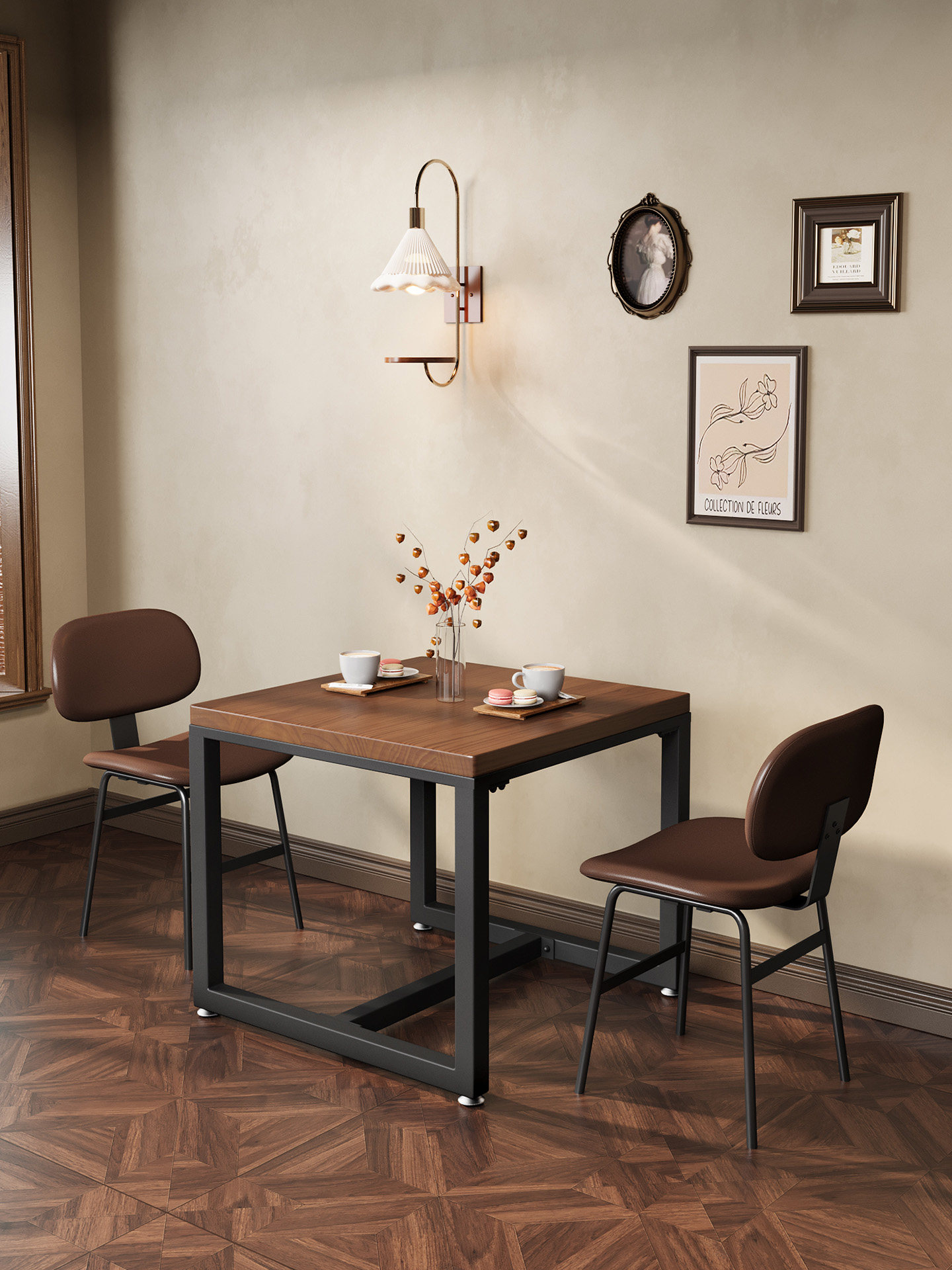 - [Квадратный стол] 70 см [Один стол и два стула] Стулья с кожаными подушками