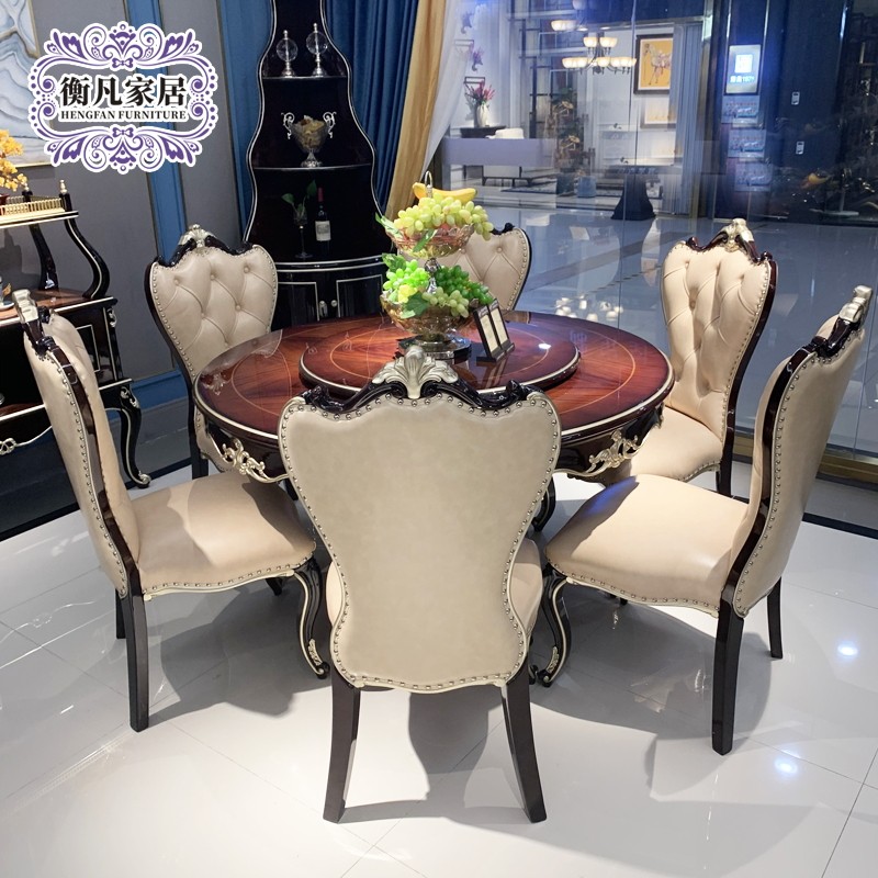 Европейский стиль круглый стол нео -классический кожаный обеденный стул Полный деревянный обеденный стол в комбинированном квартире