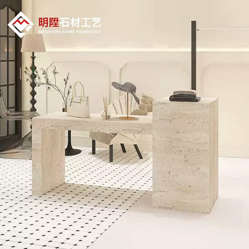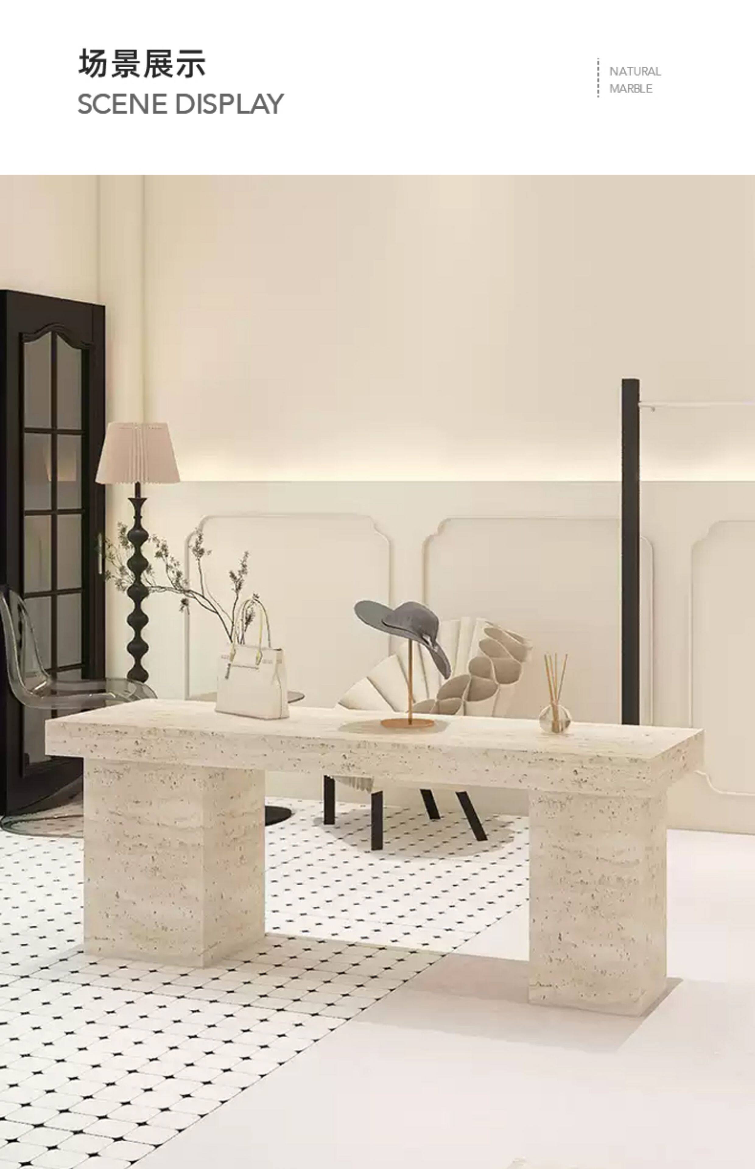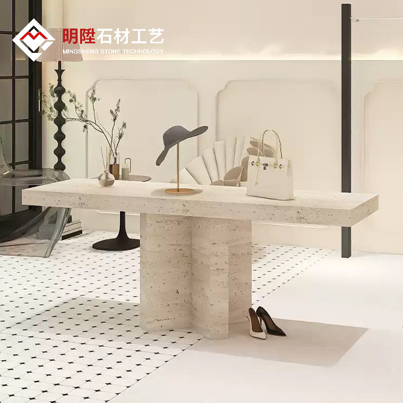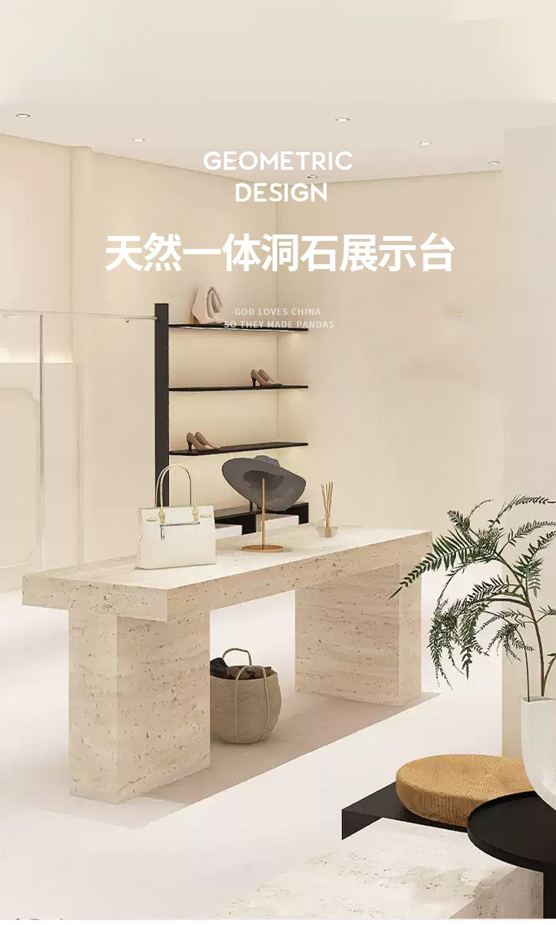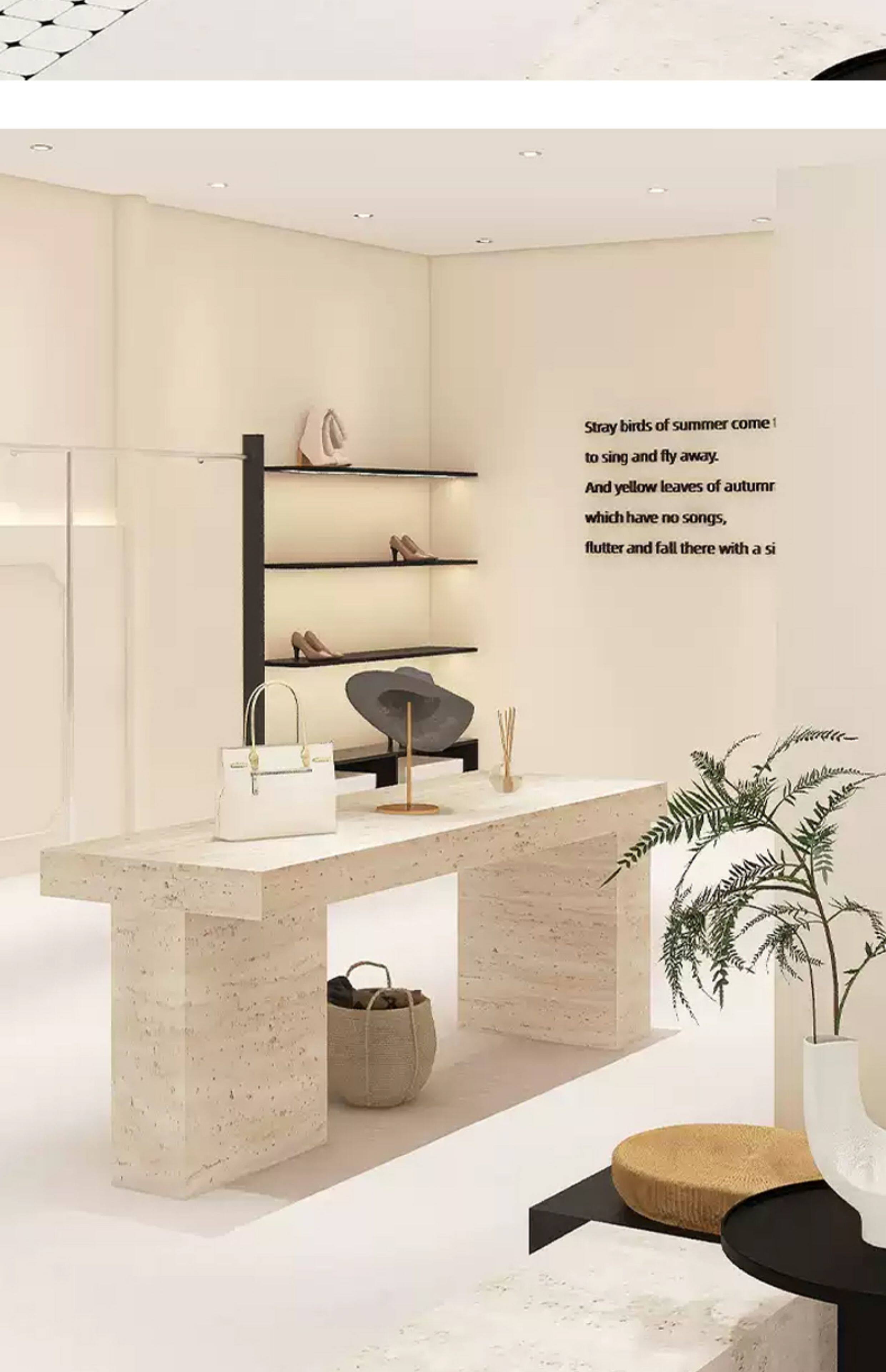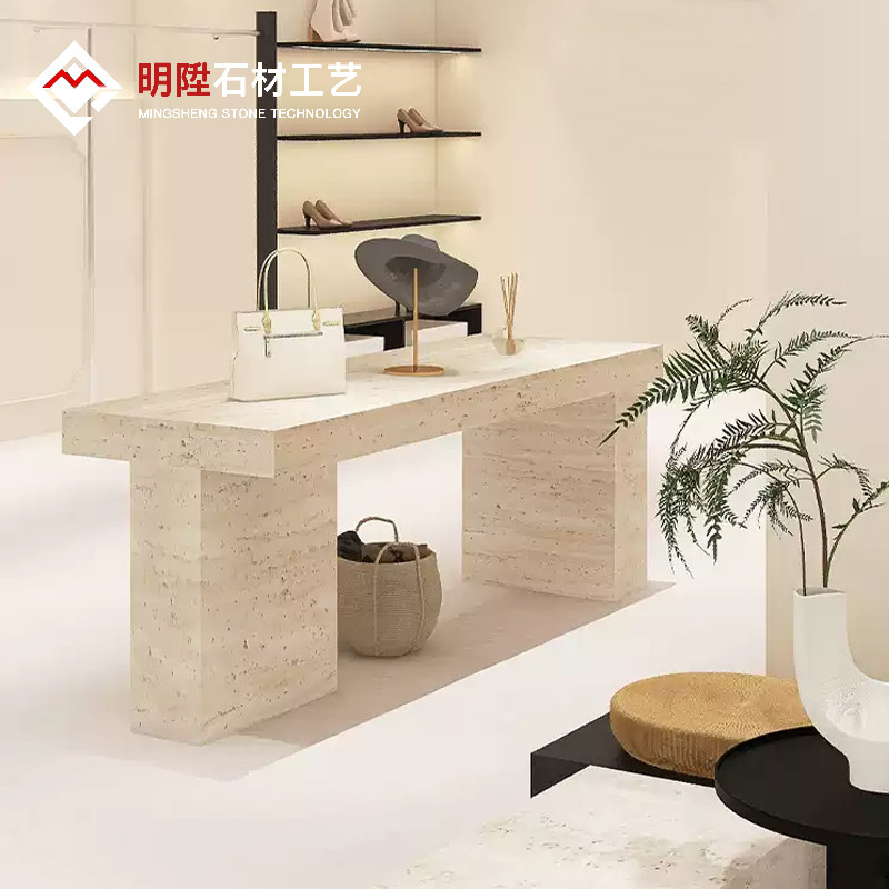 Итальянский минималистский островной витрина. Интернет-магазин знаменитостей. Стол для хранения из травертина. Витрина с реквизитом и местом для хранения посередине.