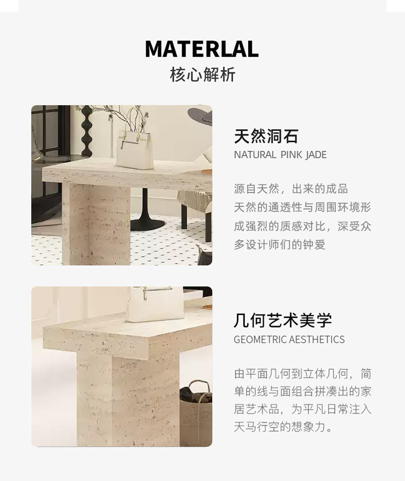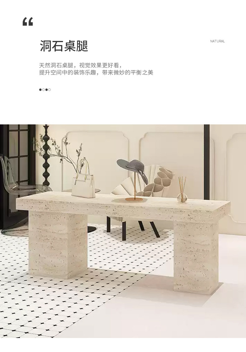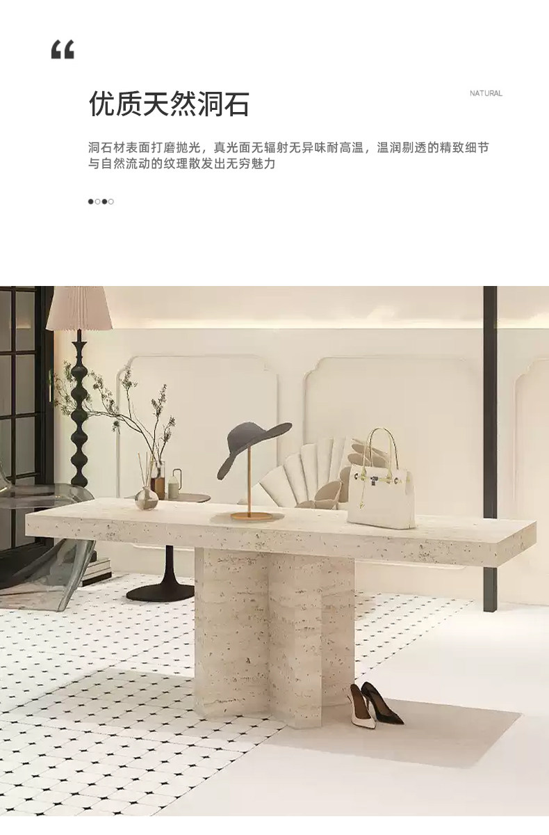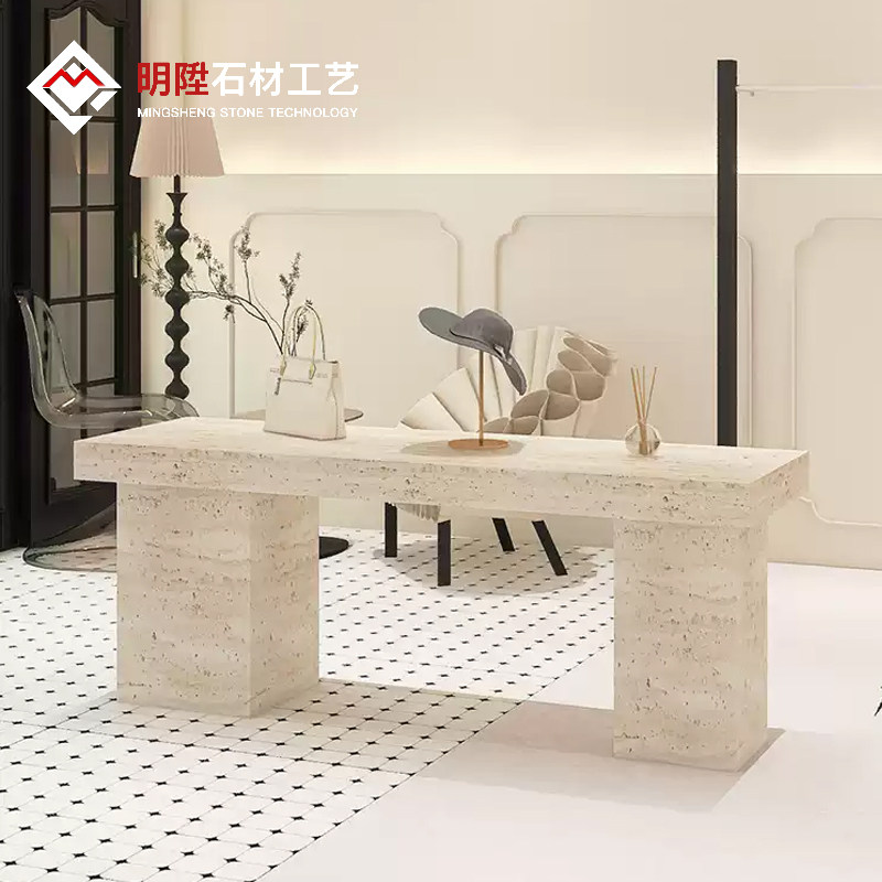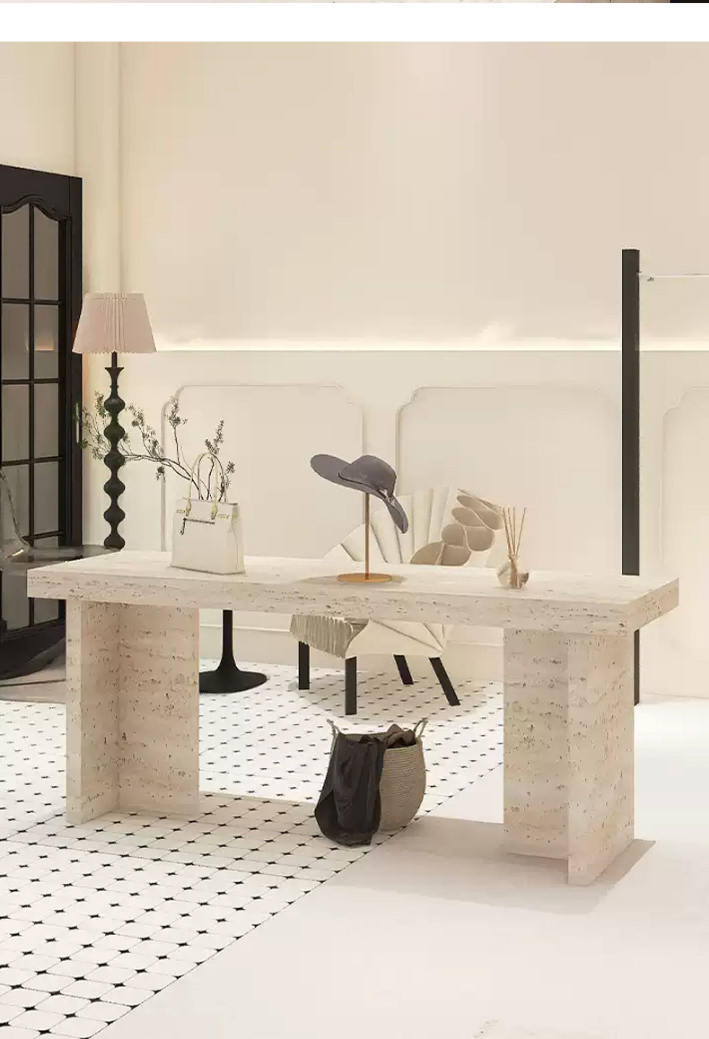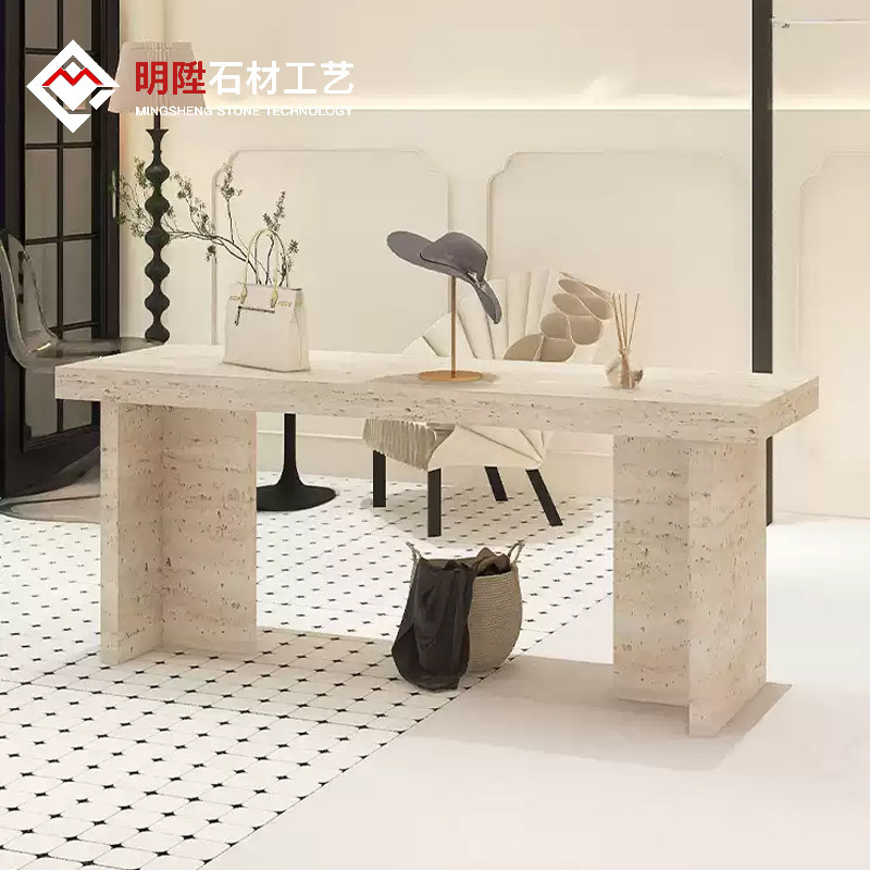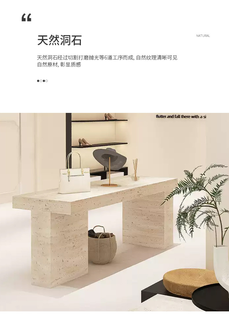 Итальянский минималистский островной витрина. Интернет-магазин знаменитостей. Стол для хранения из травертина. Витрина с реквизитом и местом для хранения посередине.