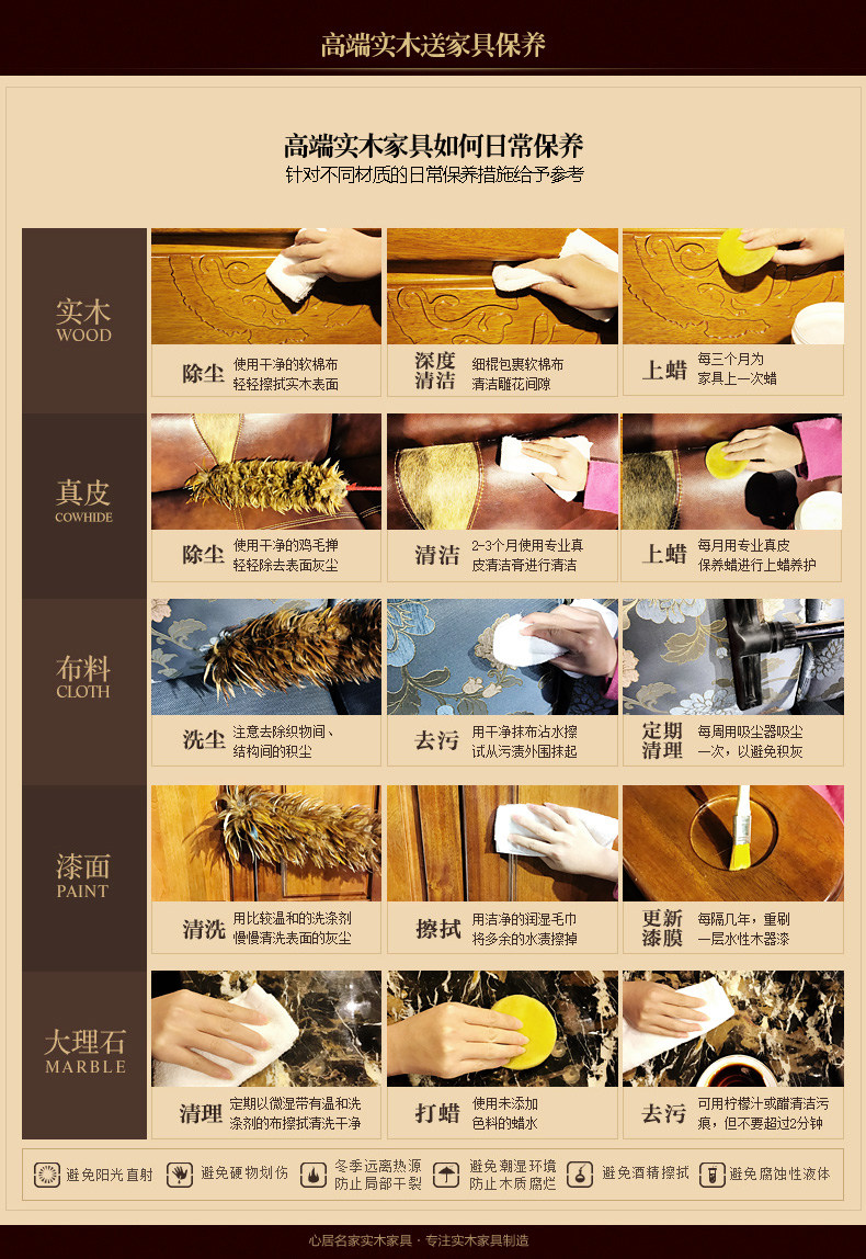 | 【Техническое обслуживание должно знать】 | Этот продукт является экологически чистым и адаптируемым, и, как правило, не требует специального обслуживания.Из -за влияния различных гетеросексуалов и факторов окружающей среды, ежедневного технического обслуживания и т. Д. Феномен тонкого растрескивания мебели из твердого древесины в отдельном климате является нормальным. Проконсультируйтесь с обслуживанием клиентов для понимания. | ||