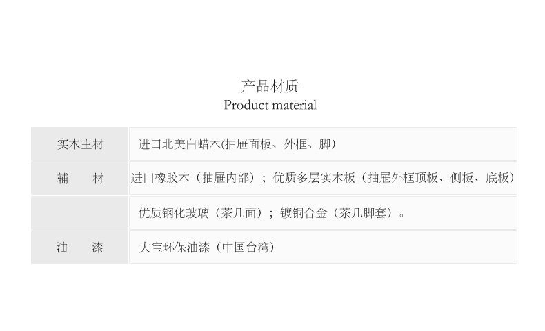 | [[[[[[[[[[[[[[[[Ингредиенты и оценки материала продуктаПолем | Основным материалом импортируется высококачественное белое восковое дерево, вспомогательные материалы представляют собой резиновую древесину, многослойную твердую древесную пластину и закаленное стекло; детали посмотрите на анализ материала и карту разложения; | ||