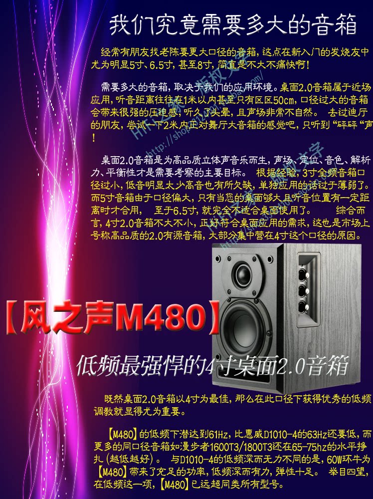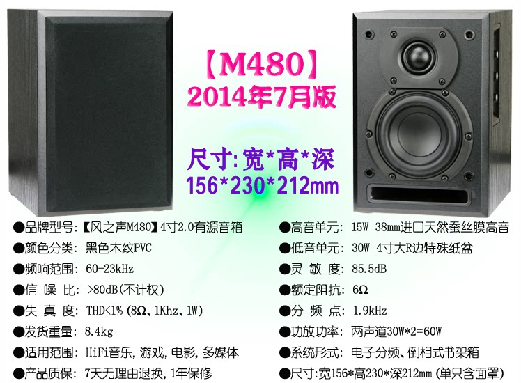 3. Размер динамика рабочего стола не должен быть слишком большим. 4-дюймовый бас является наиболее идеальным. В то же время мощность должна быть изобильной. Низкая частотная емкость может быть достаточной: та же проблема, компьютерный рабочий стол Применение, слушатель ближе к динамику, если басовый блок слишком большой - более 5 дюймов, потому что низкая частота глубокая, а многие, звуковое поле широкое, а звук попадает в уши перед звуком развернулся, что приведет к большему чувству угнетения и давнему прослушиванию.И басовый блок слишком маленький, так как 3 дюйма, погружения менее частоты, и шока недостаточно.Следовательно, настольные динамики должны составлять 4 дюйма. 4 -дюймовый басовый блок не большой. Если вы хотите получить лучшие низкие частоты и толстые средние звуки при таком уровне, требования устройства очень высоки, а мощность усилителя мощности должна быть достаточно, чтобы зарезервировать.Бас M480 специально настроен на основе хорошо известного блока как план, с высокой стоимостью и высокой доходностью. В то же время усилитель мощности имеет реальную мощность 30 Вт*2, что редко встречается на рынке.А также