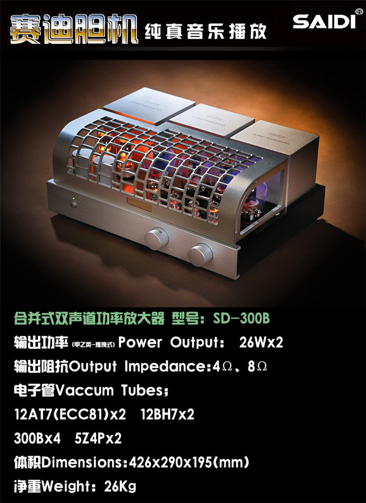мощность полной электронной трубки может сделать электронную трубку долговечной в течение длительного времени,“ желчный вкус” богатый.Усовершенствованный дизайн мощности. Каждый узел двух каналов имеет независимую деградированную цепь. Канал разделен, звуковое поле ясное, а фон молчит.Все электронные трубки включают300BПрямая тепловая трубка использует лампы зажигания зажигания переменного тока, которые способствуют низкому внутреннему сопротивлению, хорошему управлению, прозрачному звуку, деликатному звуку и яркой музыке.300BСтиль.