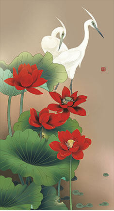 Картина, горы и текущая вода - цветы - рыба и лотос - элегантность и элегантность - библиотека стилей иллюстраций - японская дверная занавеска