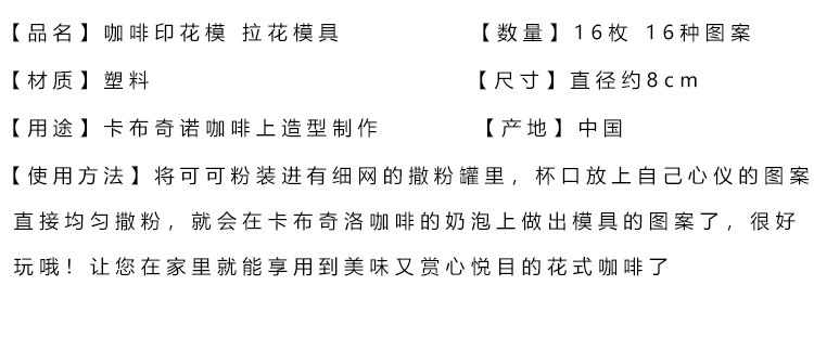 【Как использовать】Положите какао -порошок в порошок, сбрасываемый с тонкими сетями, поместите рот в рот своим любимым рисунком и посыпьте порошок напрямую и равномерно, и вы сделаете рисунок плесени на кофе Kabuccho Coffee .Позвольте вам насладиться восхитительным и приятным модным кофе дома.