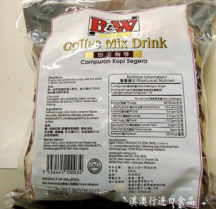 Малайзия белый кофе B & W Jianli Coffee Three -In -Solittering Coffee 600G 2 сумки Специальная специальная