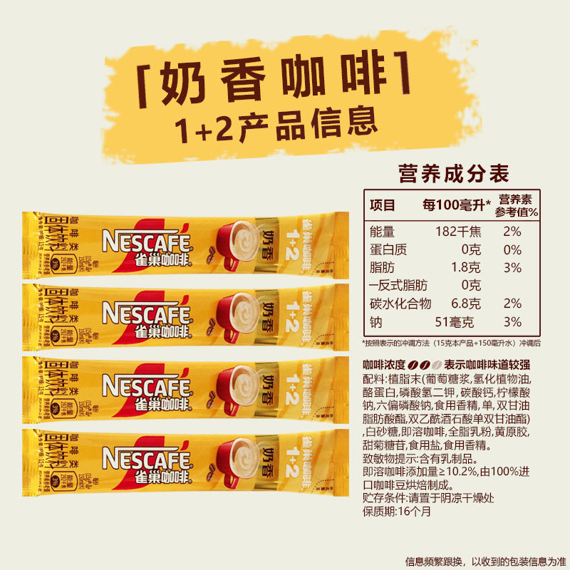 Nestlé Coffee 1+2 -это растворимый ароматный ароматный аромат молока -Три -в -внедороженный кофейный порошок 15 г маленькой полосы, чтобы заставлять студентов обновлять