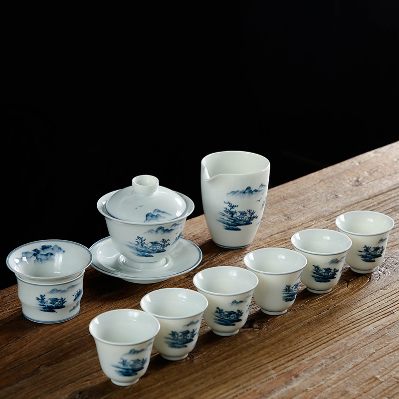 博耀 Сине-белый чайный сервиз, комплект, керамическая чайная чашка, подарочная коробка, ручная роспись, китайский стиль