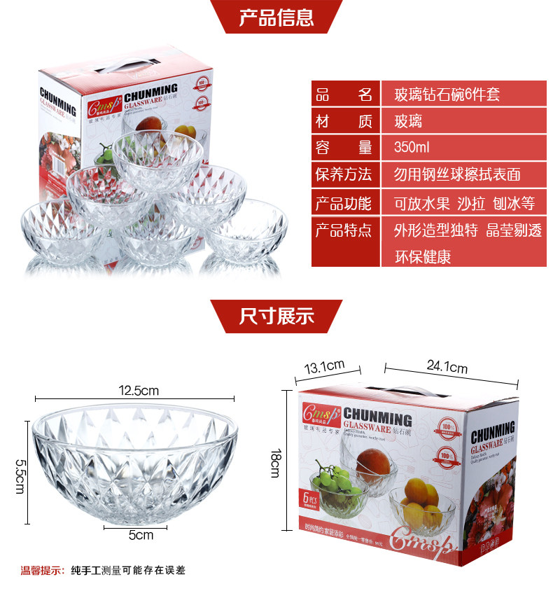 Свинцовая -Бесплатная стеклянная салат миска Домашняя рисовая чаша суп из лапши -миска Десертная чаша Продвигательство Подарочная чаша Алмазы Шесть наборов шесть наборов