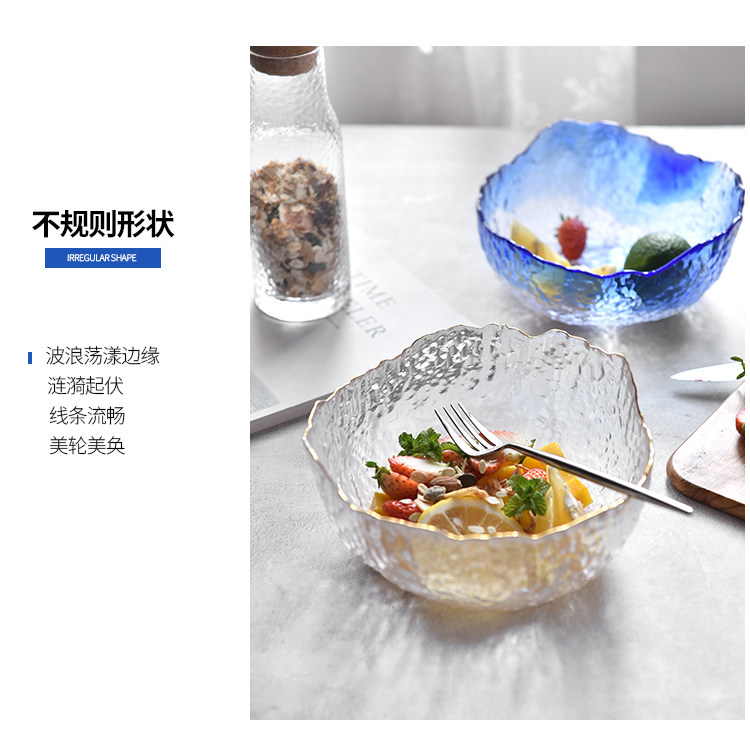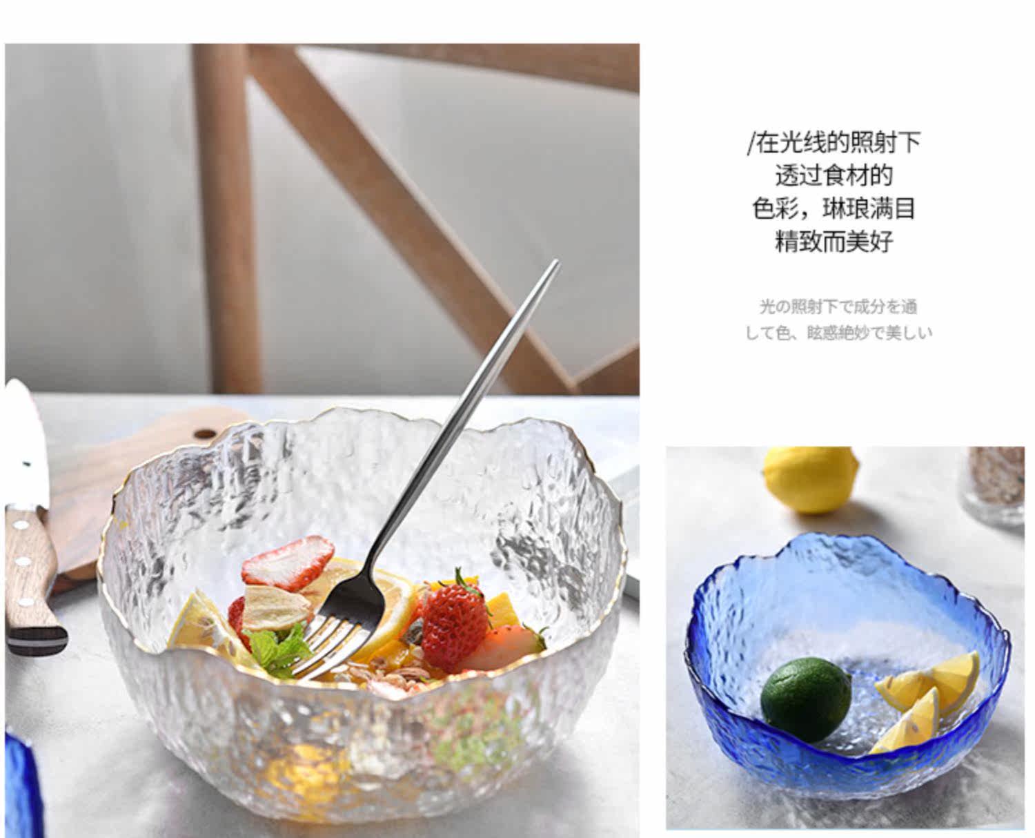У слона есть секретная прозрачная стеклянная миска, большая бытовая миска с золотой оправой, круглая большая стеклянная миска, салатница с фруктами