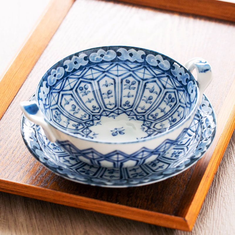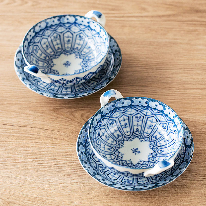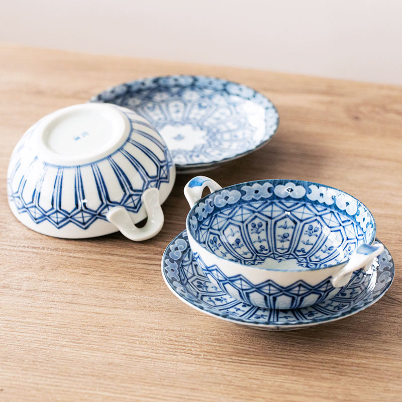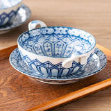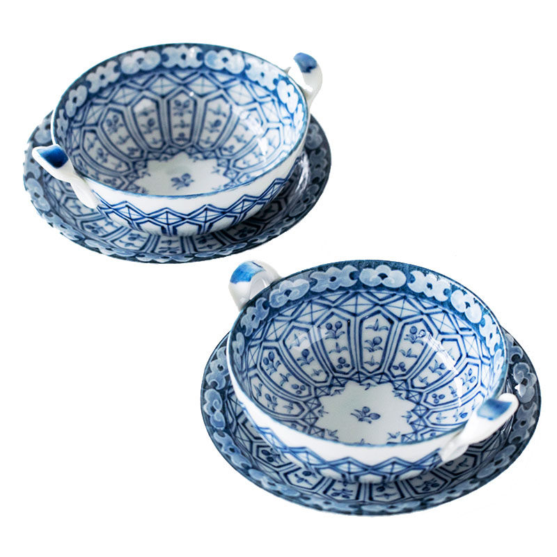 Изготовленная в Японии Мино-яки Имари, окрашенная парчой, сине-белая керамическая миска с двумя ушками, противоожоговая миска для супа с лапшой и подносом, кастрюля для тушения яиц на пару
