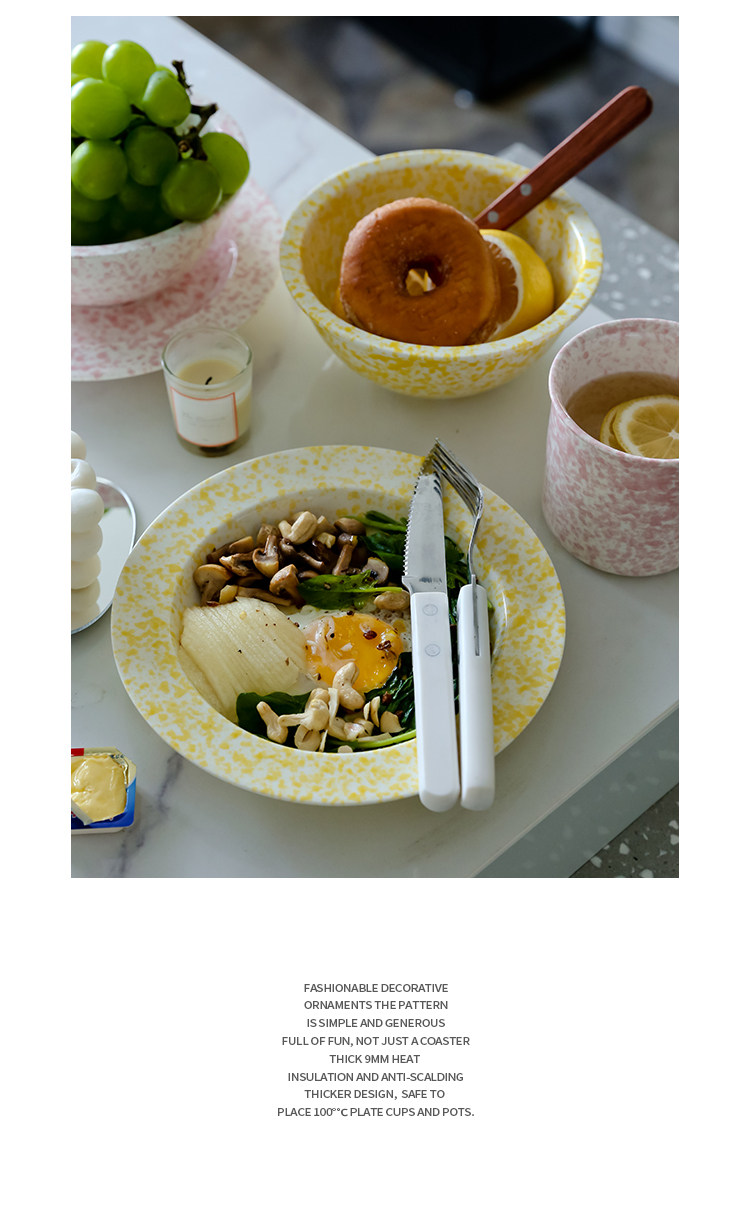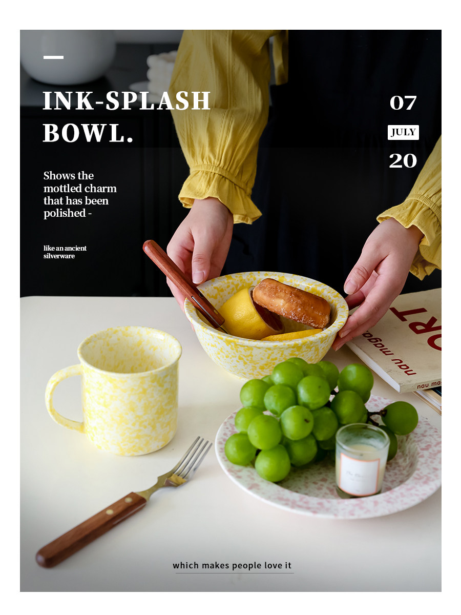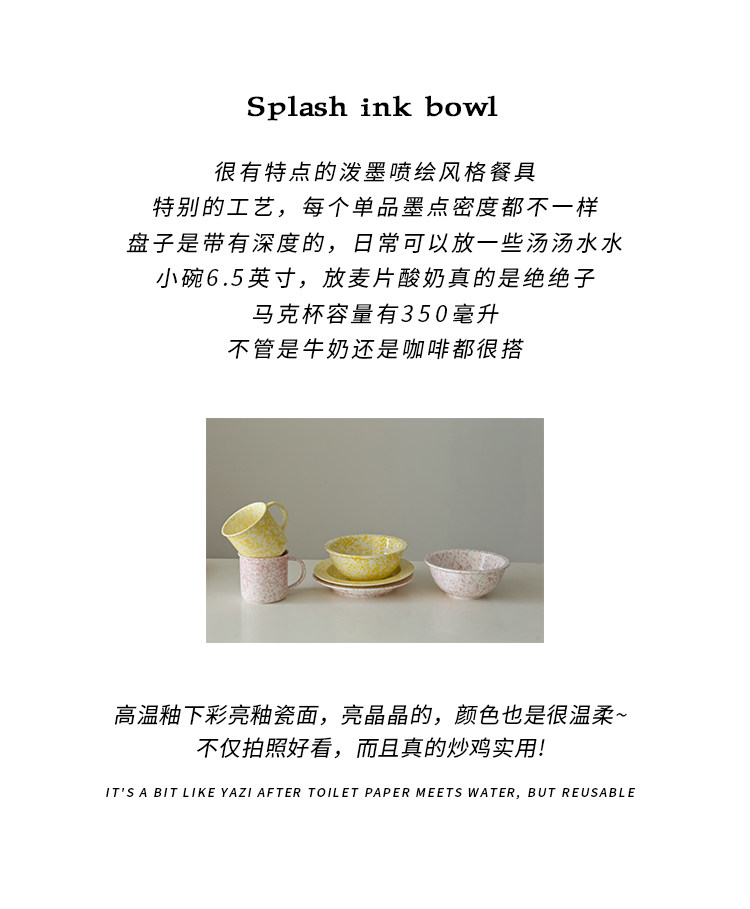| Цвет: | Розовый брызговой суп, Розовый салат -чаша для брызг, Розовый всплеск, Желтая тарелка для суповой чернила, Желтый брызги темный салат миску, Желтый всплеск |