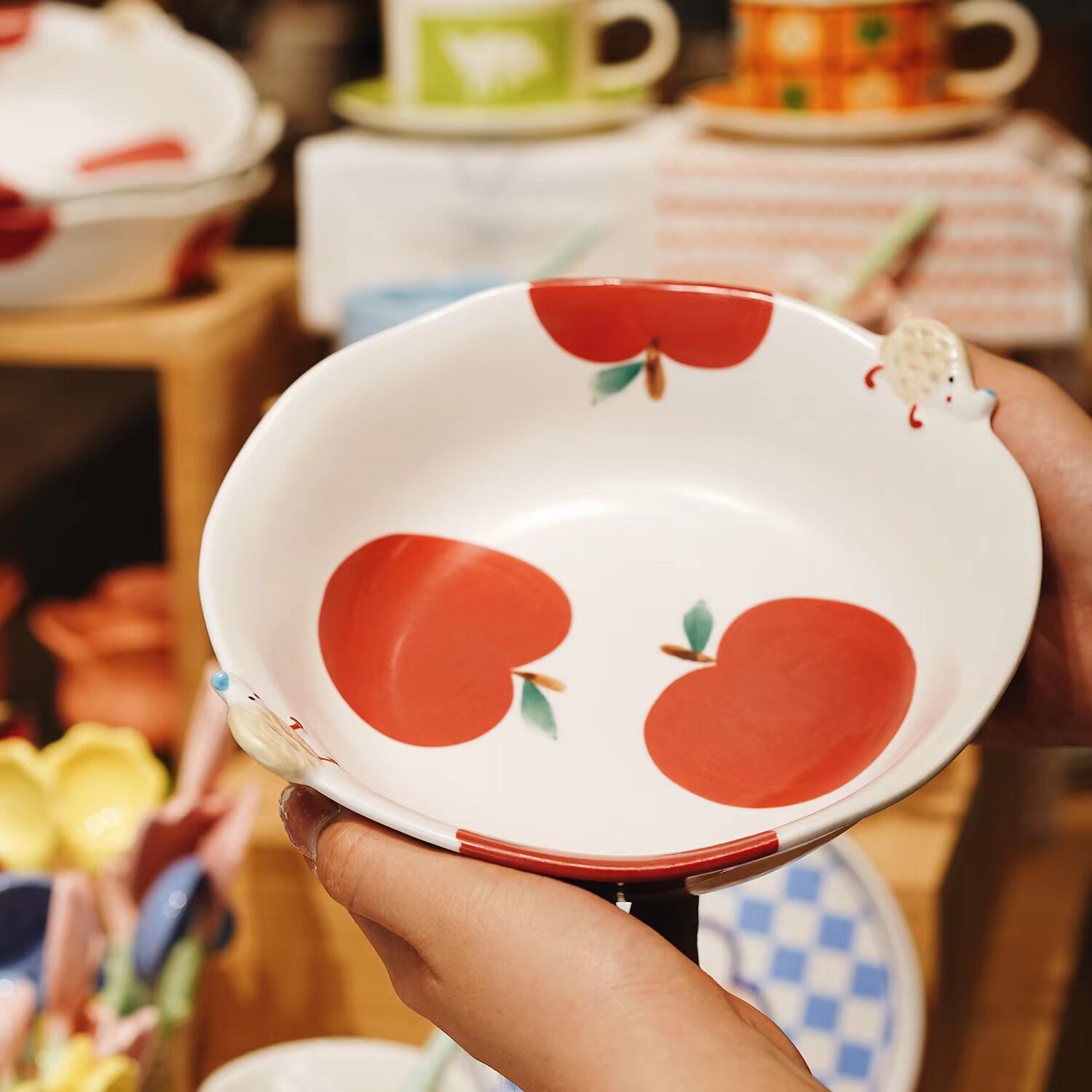 Есть фрукт.Ручная ручная нерегулярная керамика большая миска яблочная эычная рисунка милая салат вода