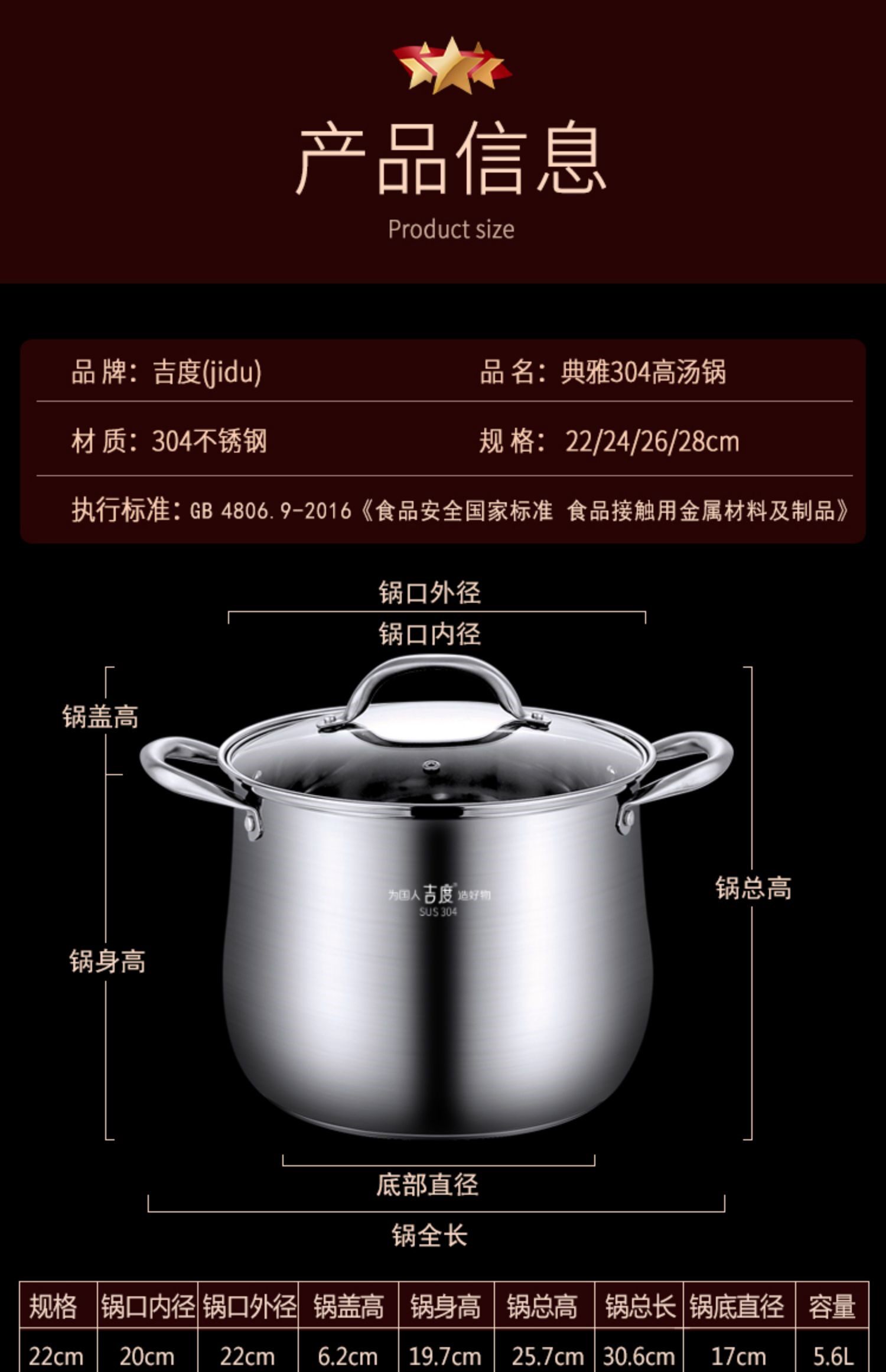 - Элегантная модель 304 Стальной суповой горшок 22 см (для 2-4 человек)
