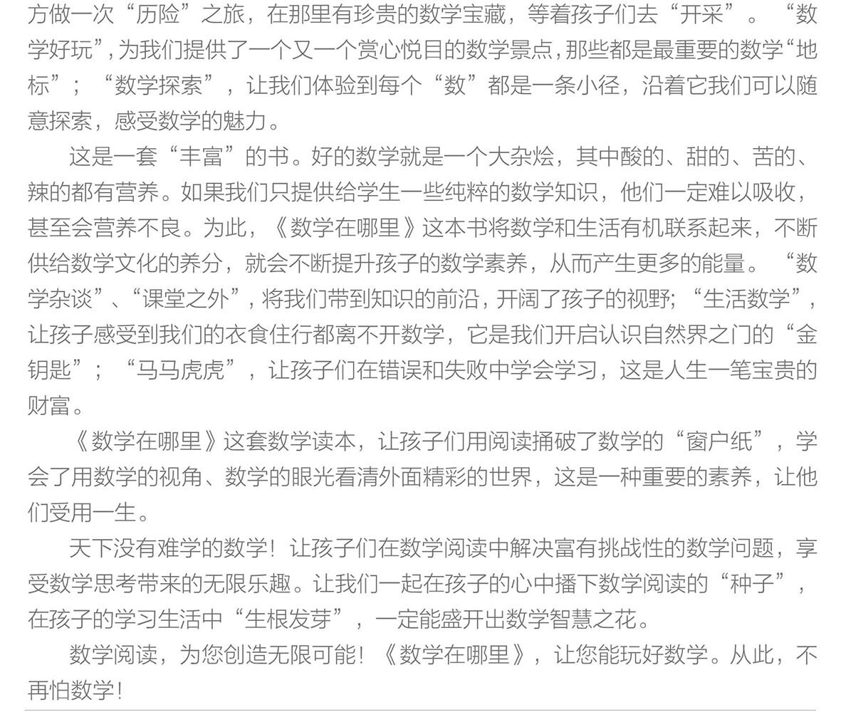 Этот набор книг в соответствии с“”Содержание каждого подразделения чтения синхронизируется с прогрессом математических учебников, таких как версия для человеческого образования, Пекинский нормальный университет и издание Чжэцзян.“&Rdquo; Интерес учеников начальной школы для изучения математики и расширения знаний по математике.