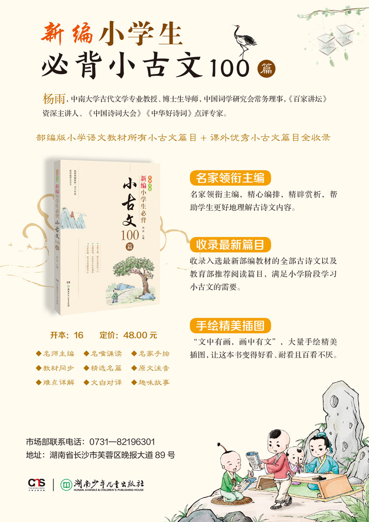 «Новые ученики начальной школы должны обрабатывать пожилые 100 статей», включающие все древние статьи в новом издании китайских учебников в новом выпуске учебников из китайского языка. В то же время он выбрал другие учебники, подходящие для учеников начальной школы, чтобы прочитать . Почувствуйте стиль китайской традиционной культуры.Мало того, что есть в книге“ введение в автора (профиль)”“ слово интерпретация”“ древний текстовый перевод” ожидание традиционных столбцов, тщательно настроенная“ чувства”&Ldquo; забавная история&Rdquo; и другие специальные колонны, в сочетании с аудио и изысканными иллюстрациями, могут помочь учащимся начальной школы понять древние тексты и улучшить их интерес к древнему текстовому обучению.