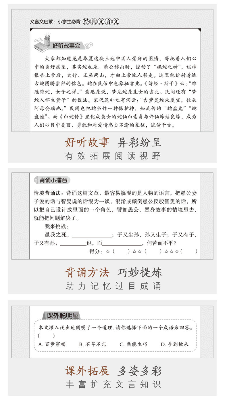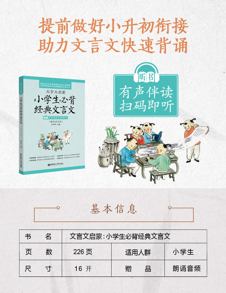 «Классическое эссе Просвещение: ученики начальных классов должны запомнить классический классический классический китайский (подарочный аудио для чтения)» выбрали 80 классических классических персонажей, разделенные на мифы и легенды, истории о басне, Конфуций и Менсиус, Детский язык, мудрость и таланты, талантливые герои, герои, герои, герои, герои, герои, герои, герои, конфуций и Менсиус, Детский язык, мудрость и таланты, талантливые герои, герои, герои, конфуций и Менсиус, детский язык, мудрость и таланты, талантливые герои, герои, конфуций и Менсиус, язык детств Таланты, верность и мудрость героев, практика мингжи, разговор о животных, разные растения, странные горы, досуг и расслабление, ландшафтные заметки о путешествиях, культурное наследие и идеальное общество.Каждая статья включает в себя классические комментарии, студии записи чтения, хорошие истории, чтение небольших колец, умные классные дома и другие разделы.Аудио для чтения, включенное в книгу, читается профессионалами, которые могут помочь студентам прочитать произношение и развивать чувство классического китайца; чтение ритма, руководство тона и тон способствует лучшему поглощению эмоционального значения классического китайца; Уточнение методов чтения, таких как методы чтения, более способствует чтению.Короче говоря, эта книга является классической и короткой.