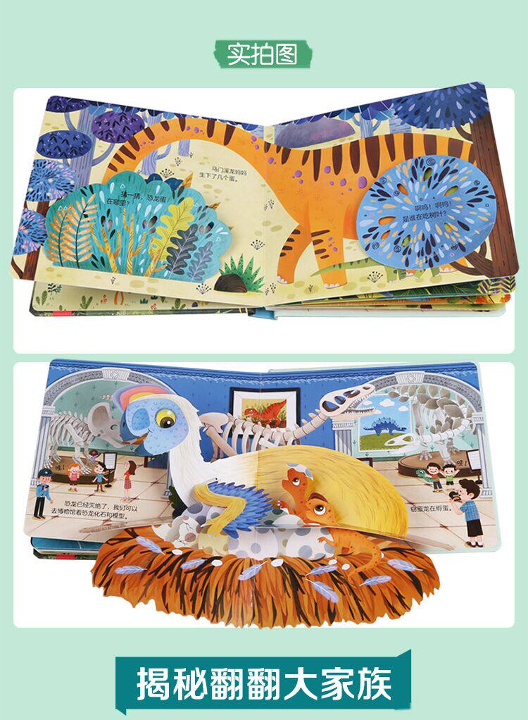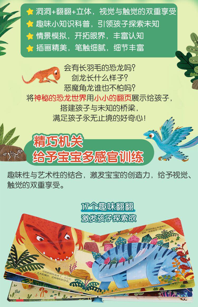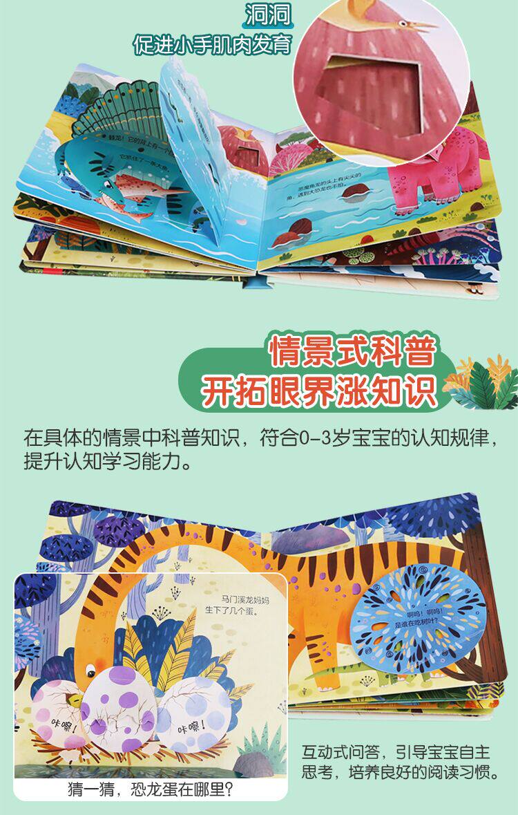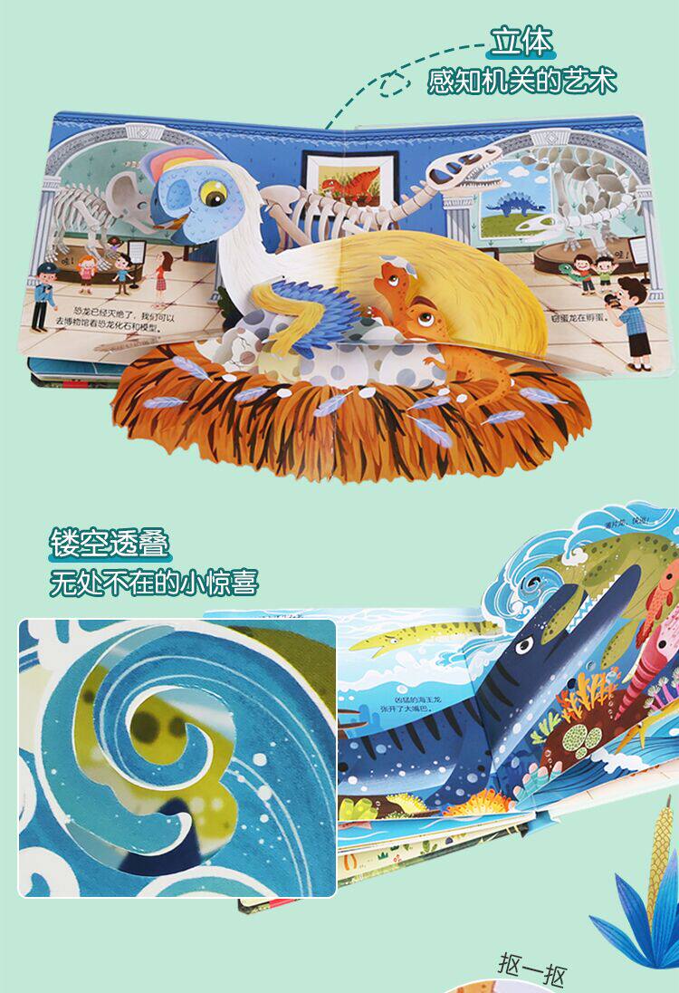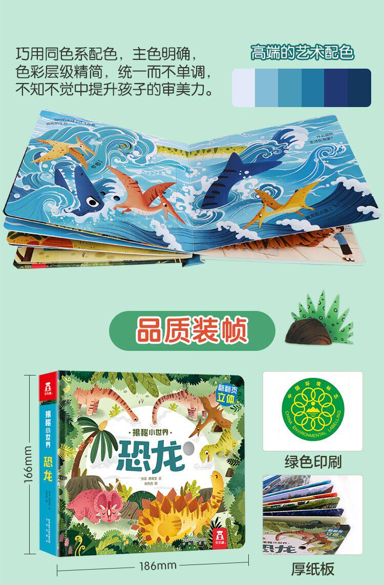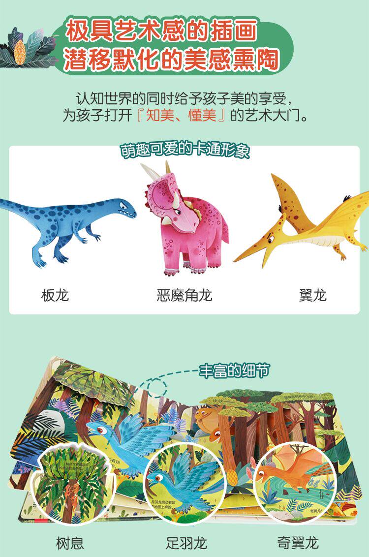 - Изысканные ручные иллюстрации, мягкие цвета, воспроизводят различные динозавры, которые когда -то жили на земле, позволяя детям улучшить свои эстетические способности в чтении и дать детям качественное чтение и удовольствие;