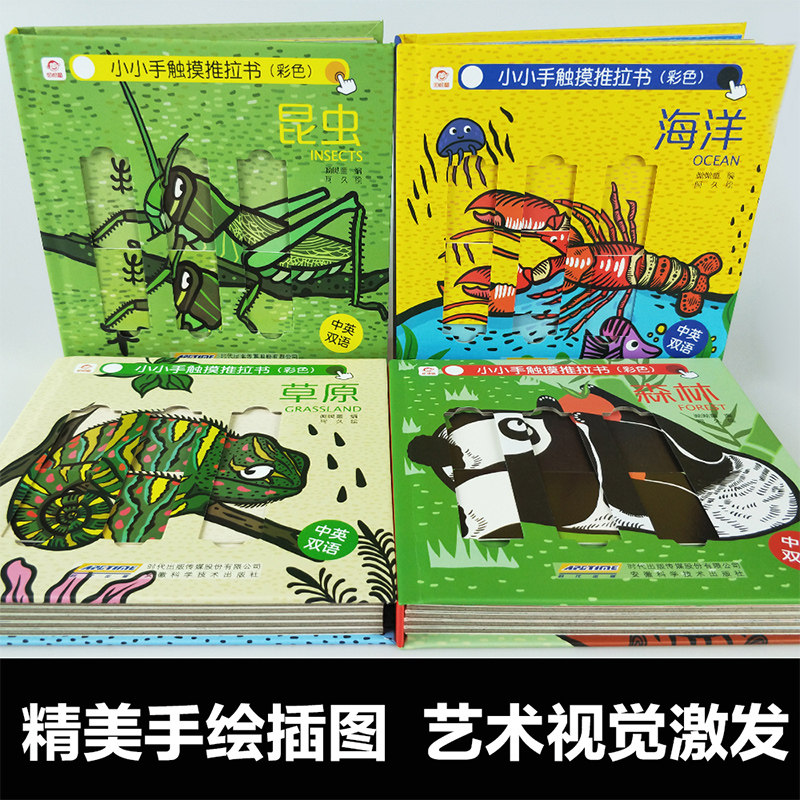 Маленькие ручки касаются цветной книжки-тяни-толкай, всего 4 тома на китайском и английском языках, от 0 до 3 лет, познавательное просвещение детей, прочная раскладная книжка.