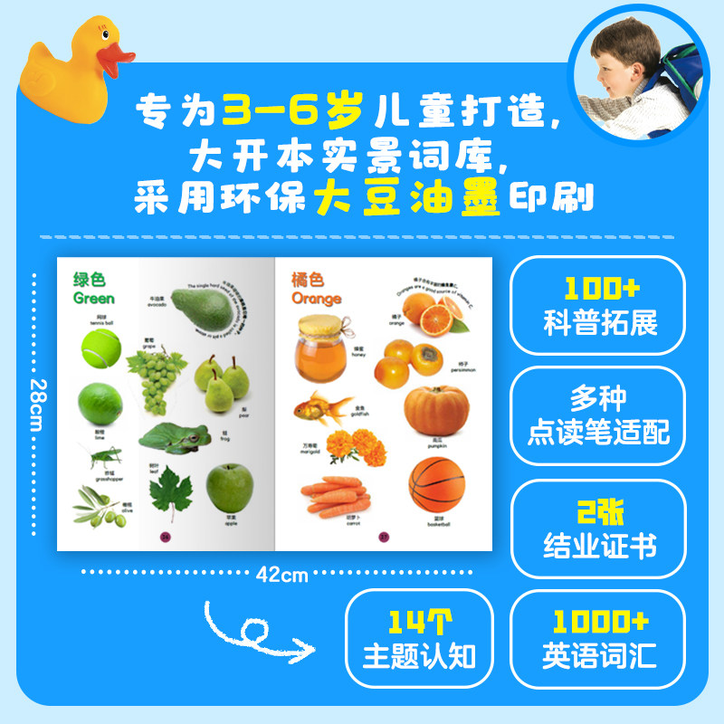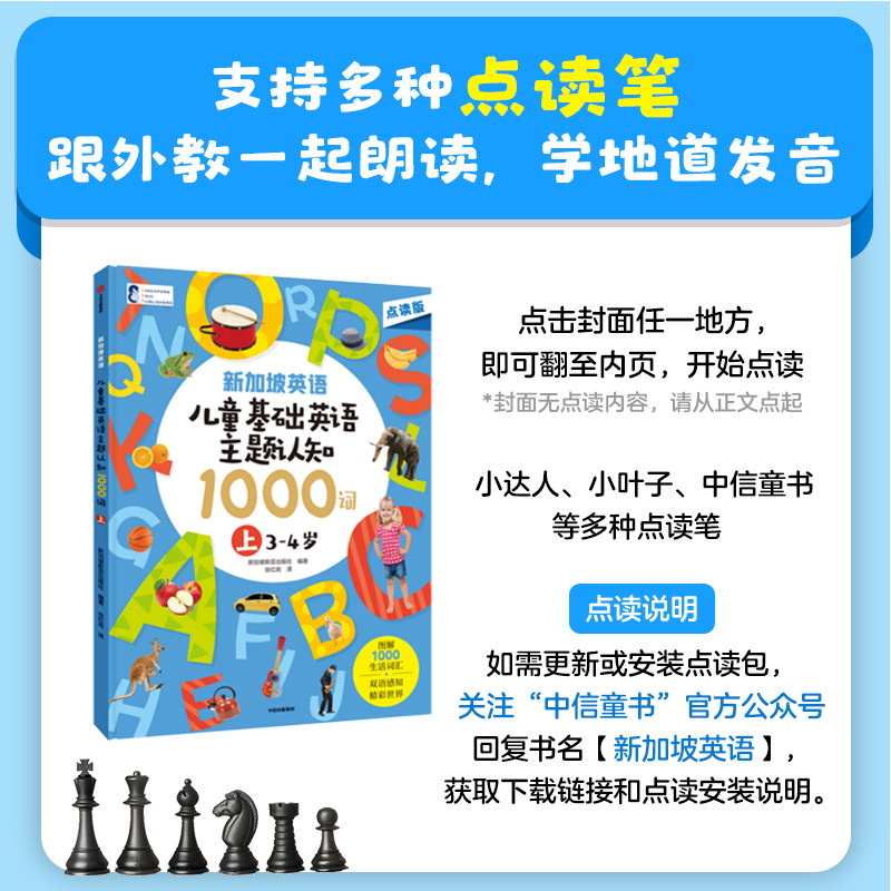 «Сингапурский английский»·Детская базовая английская тема для познания 1000 слов (Часть 1) 3-4 года»Эта книга представляет собой набор книг для детей в возрасте от 3 до 6 лет, предназначенных для изучения, чтения и накопления английской лексики.Помимо помощи детям в создании обширной словарной библиотеки, в процессе чтения они также могут узнавать о происходящем вокруг них посредством двуязычия.Овладение определенным словарным запасом является прелюдией к путешествию ребенка по чтению английского языка. Чем больше вы знаете о словарном запасе, тем охотнее вы будете читать. Полный комплект книг состоит из 2 томов, начиная с 14 основных познавательных тем для детей младшего возраста, и содержит в общей сложности 1000 слов, часто используемых в повседневной жизни.Его можно адаптировать к ручкам для чтения большинства марок, представленных на рынке, включая Xiaodaren, Xiaoyezi, CITIC Children's Books, eBay, Tadpole и т. д.