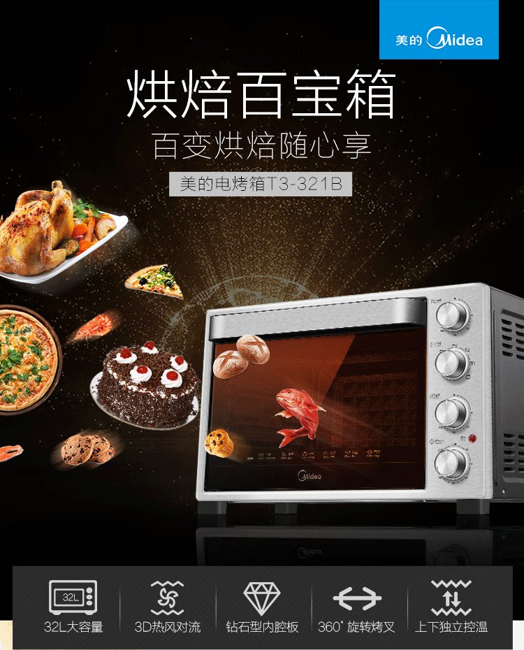 Midea/美的 T3-321B Home Многофункциональная выпечка 360 & deg; вращающаяся на гриле вилочное серебро