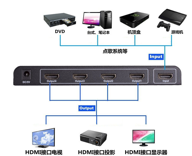 Функция: выделить 1 сигнал HDMI на 4 сигнала и 4 устройства отображения, чтобы играть одновременно