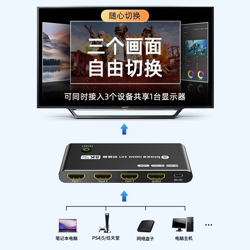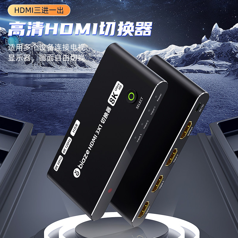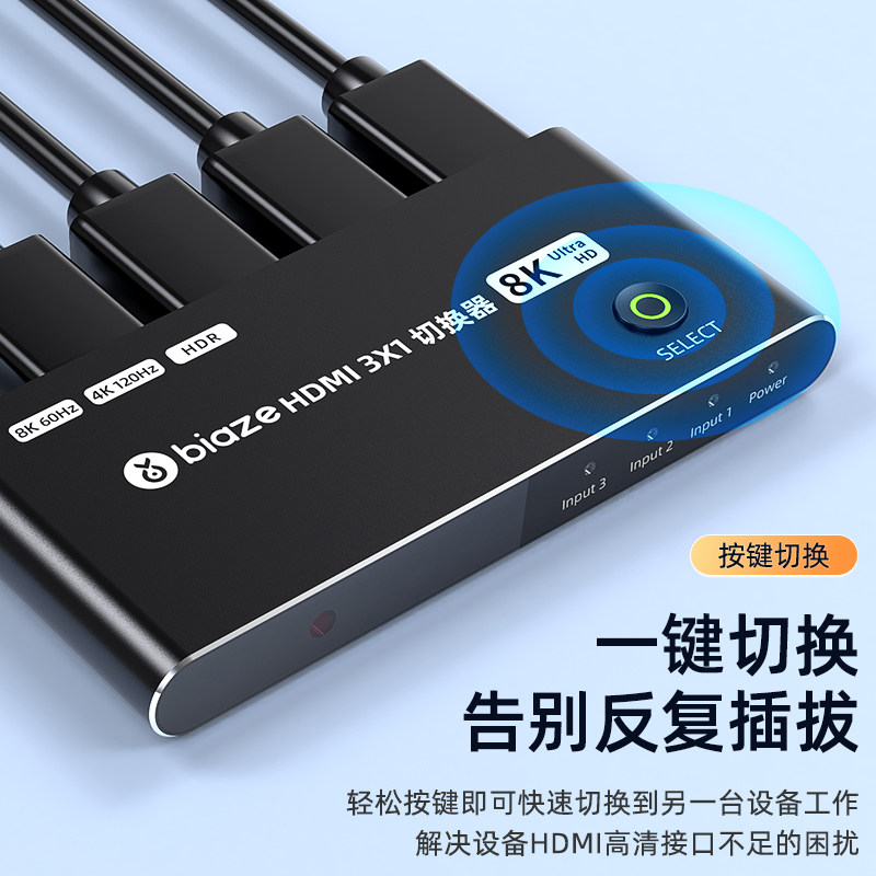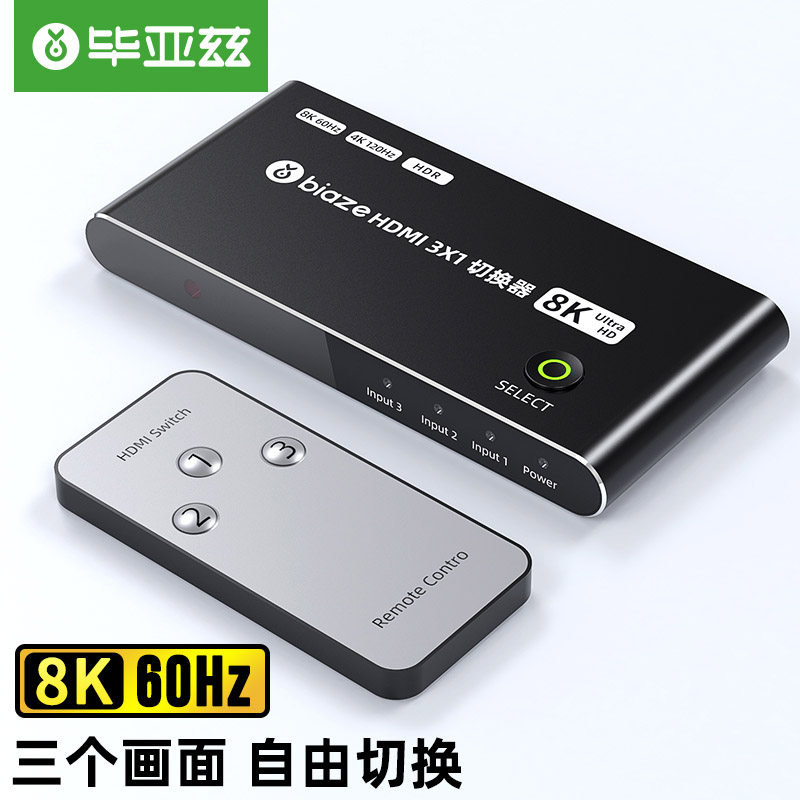 Biaz HDMI Switching 2.1 Три -In -One -out Converter с дистанционным управлением HD 8K -сигналом компьютера.