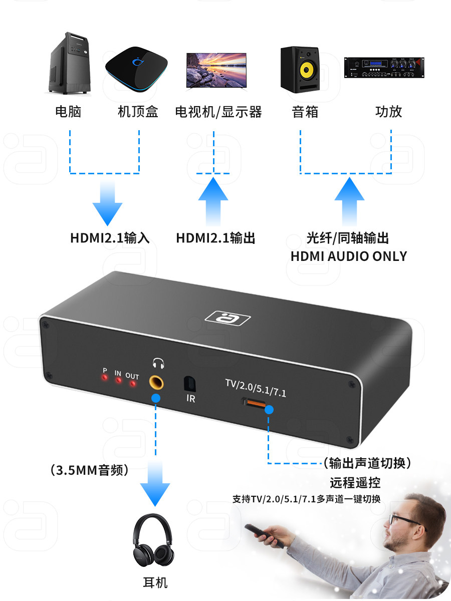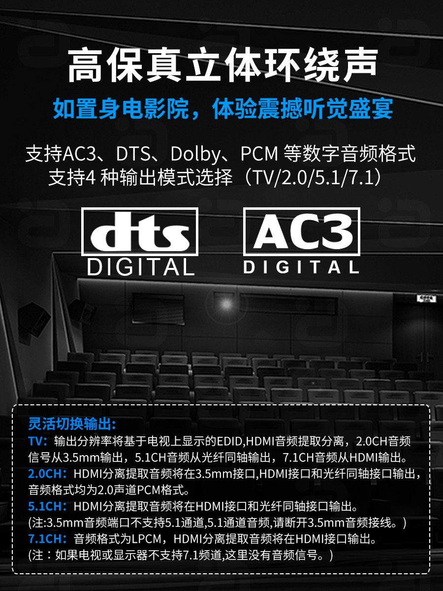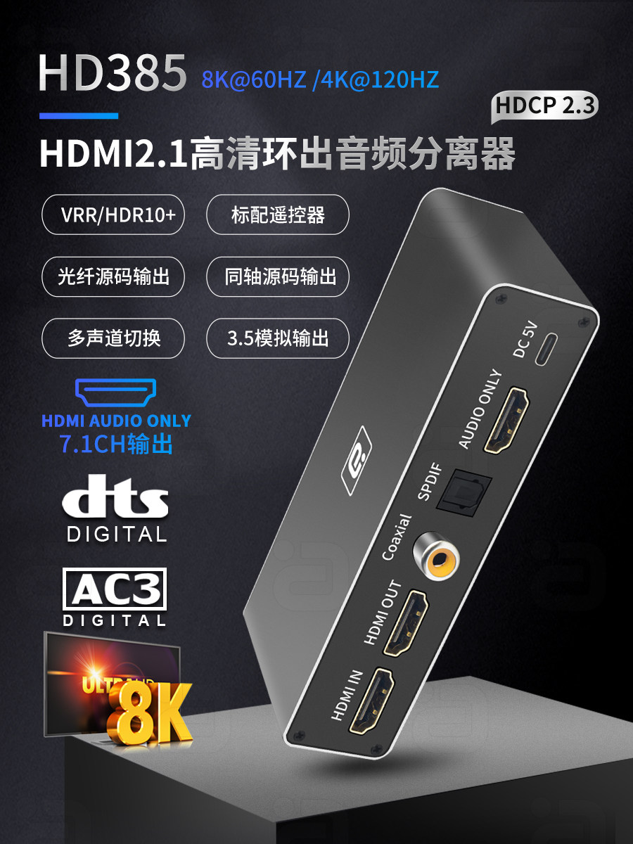 Ayin HDMI2.1 Аудио сепаратор 8K60HZ HD DTSHD Panorama 7.1CH Fibre Optical Coaxial Demote