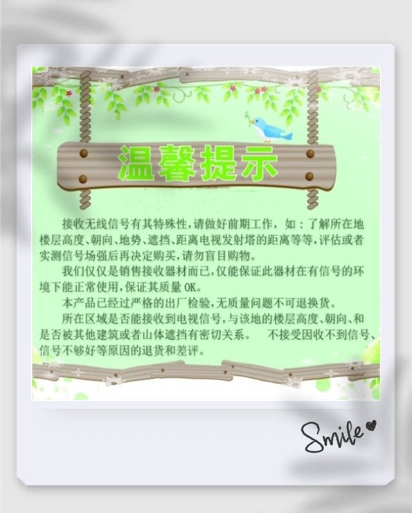 Добрые советы:Радио -телевидение в любом регионеРасстояние передачи сигнала ограничено. Хотя антенна с высоким уровнем гнева предназначена для беспроводных телевизоров, независимо от того, насколько хороша антенна принимается в дополнение к диапазону покрытия передачи сигнала.Даже в пределах достоверного диапазона сигнала это может повлиять на полученный эффект из -за воздействия местности и местности на окружающую среду, такие как высокие здания или альпийские блоки.Поэтому нет сигнала или сигнала, получающего слабое место, независимо от того, насколько хороша антенна может играть, пожалуйста, заставьте друзей понять.