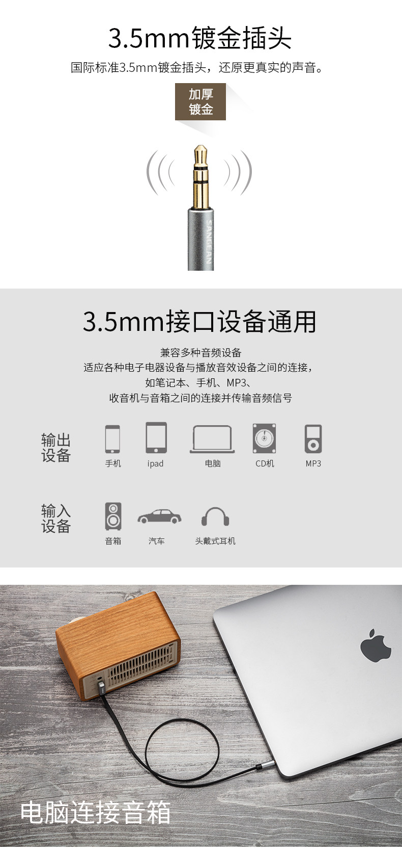Sangean/Shanjin Audio Cable 3,5 мм интерфейс 1 метр в длину золотой локоть локоть высокий кабель верности