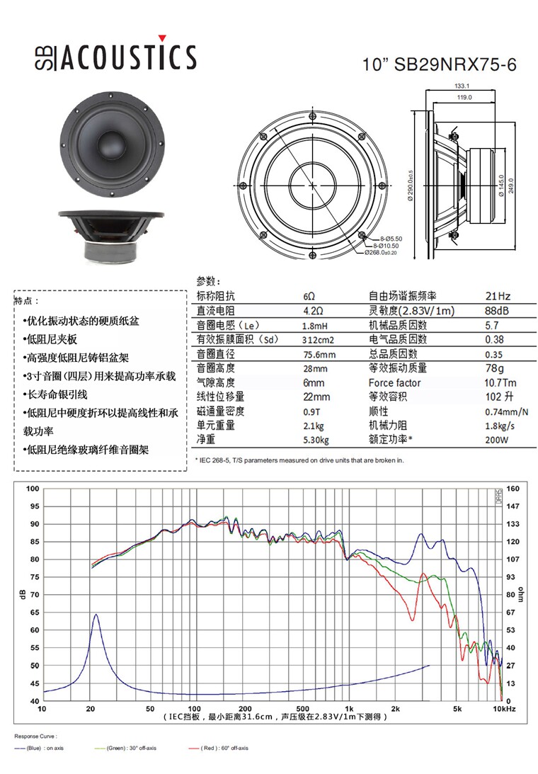 SB Acoustics Spot SB29NRX75-6Ω композитный бумажный диффузор 10-дюймовый низкочастотный динамик диаметром 290 мм