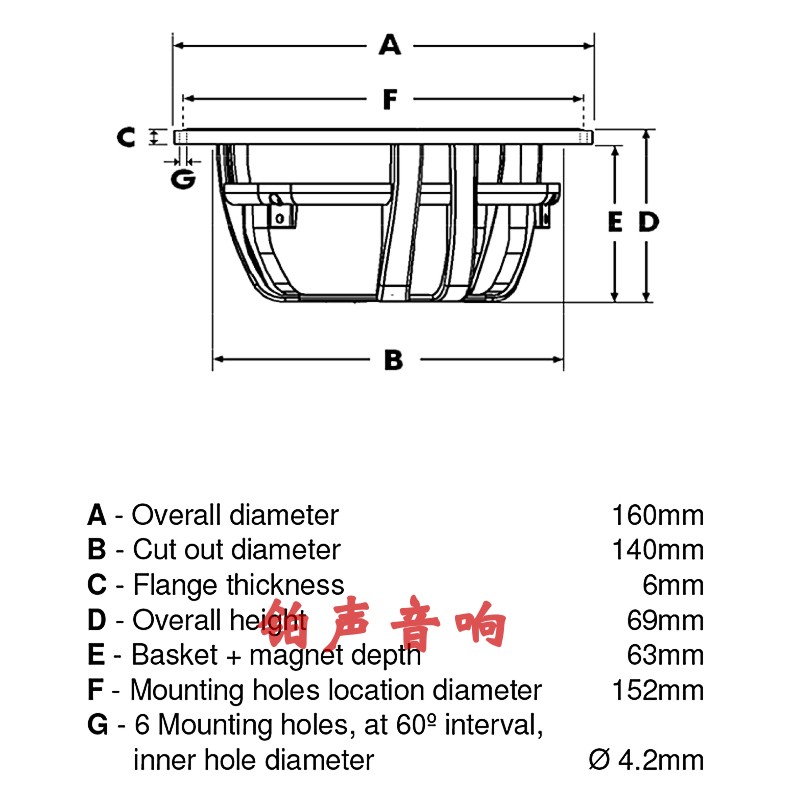 1. Динамик представляет собой 6 -дюймовый PP Pot, бас в горшке, внешний диаметр 160 мм, 8 -европеданс, чувствительность 87 дБ, общая подача агента;