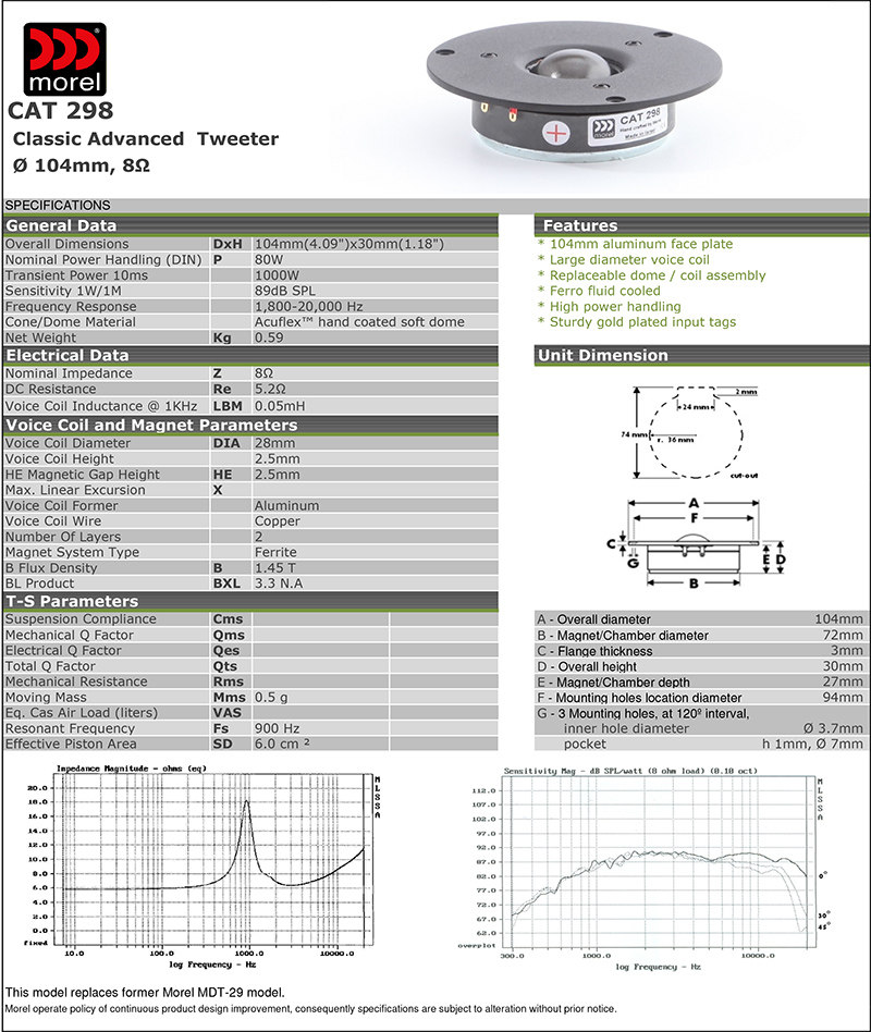 Основанная в 1975 году и со штаб -квартирой в Израиле, Морел является производителем акустических подразделений и премиальных аудиопродуктов.Его сабвуфер известен различными полипропиленовыми диафрагмами и композитными диафрагмами углеродного волокна, дополненными голосовой катушкой большого диаметра, которая может нести мощное вождение, и имеет характеристики атмосферного и спокойного качества звука; Его твитер известен своими прозрачными шелковыми диафрагмами, с теплым и нежным тоном, который является лучшим выбором, чтобы показать коннотация музыки.