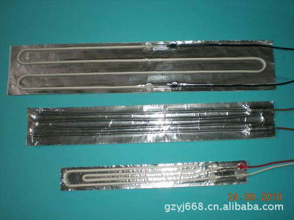 - Нагреватель образуется путем размещения силиконовой резиновой нагревательной проволоки между двумя кусочками алюминиевой фольги с чувствительным к давлению клей. Нижняя поверхность алюминиевой фольги может быть оснащена чувствительным к давлению клея для легкого вставки.