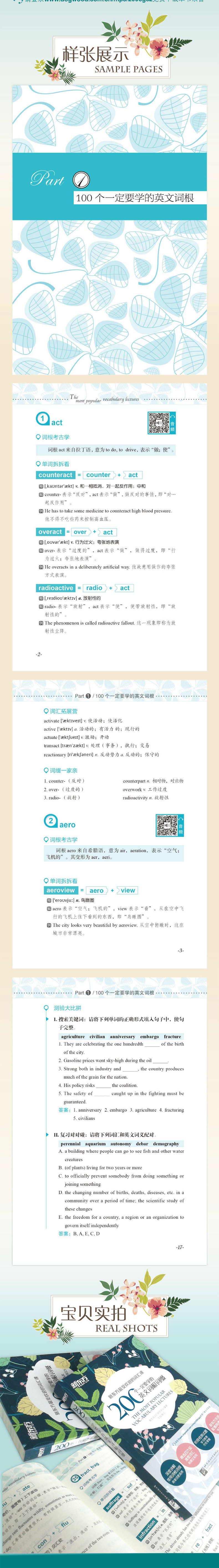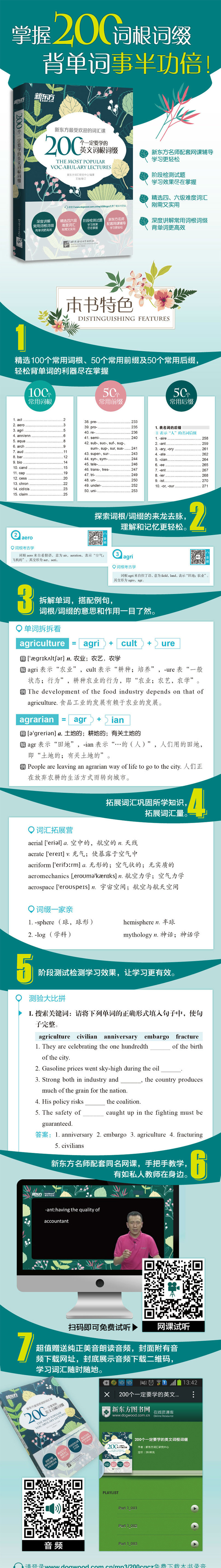Эта книга содержит в общей сложности 100 общих английских корней, 50 обычно используемых английских префиксов и 50 общих английских суффиксов, следите за происхождением, глубоко анализирует происхождение и значение этих корней, аффиксы помогают читателям понять и помнить.Выбор словарного запаса составляет 4 или шесть сложности, просто необходима и практично.Существуют также расширяющиеся вопросы словаря и тестирования на сцене, которые помогают консолидировать изученные знания.Новые восточные учителя преподают вспомогательные онлайн -курсы, которые также оснащены стандартным аудиоизданием вслух, что является более удобным, простым и эффективным.